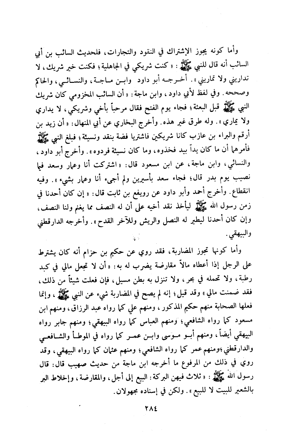 وأما كونه يجوز الإشتراك في النقود والتجارات فلحديث السائب بن أبي سائب أنه قال للنبي صلى الله عليه وسلم "كنت شريكي في الجاهلية فكنت خير شريك لا تداريني ولاتماريني" أخرجه أبو داود وابن ماجه والنسائي والحاكم وصححه وفي لفظ لأبي داود وابن ماجه أن السائب المخزومي كان شريك النبي صلى الله عليه وسلم قبل البعثة فجاء يوم الفتح فقال: "مرحبا بأخي وشريكي لا يداري ولا يماري" وله طرق غير هذه وأخرج البخاري عن أبي المنهال أن زيد بن أرقم والبراء ابن عازب كانا شريكين فاشتريا فضة بنقد ونسيئة فبلغ النبي صلى الله عليه وسلم فأمرهما "أن ما كان يدا بيد فخذوه وماكان نسيئة فردوه" وأخرج أبو داود والنسائي وابن ماجه عن ابن مسعود قال: "اشتركت أنا وعمار وسعد فيما نصيب يوم بدر قال: فجاء سغد بأسيرين ولم أجئ أنا وعمار بشيء" وفيه انقطاع وأخرج أحمد وأبو داود عن رويفع بن ثابت قال: "إن كان أحدنا في زمن رسول الله صلى الله عليه وسلم ليأخذ نقد أخيه على أن له النصف مما يغنم ولنا النصف وإن كان أحدنا ليطير له النصل والريش وللآخر القدح" وأخرجه الدارقطني والبيهقي.