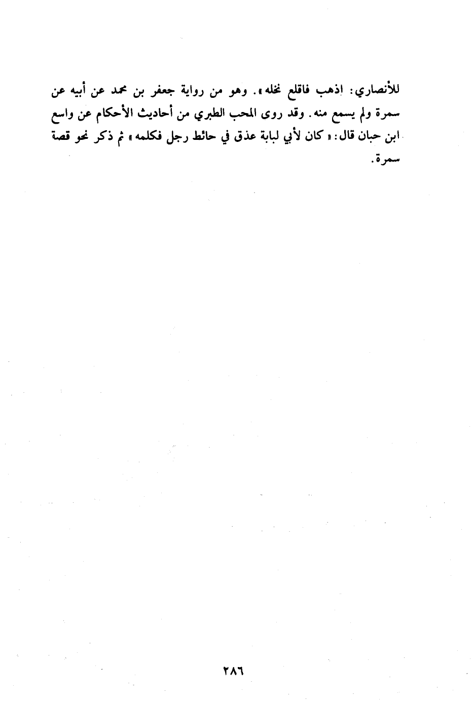 للأنصاري اذهب فاقلع نخلة" وهو من رواية جعفر بن محمد عن أبيه عن سمرة ولم يسمع منه وقد روى المحب الطبراني من أحاديث الأحكام عن واسع بن حبان قال: "كان لأبي لبابة عذق في حائط رجل فكلمه" ثم ذكره نحو قصة سمرة.