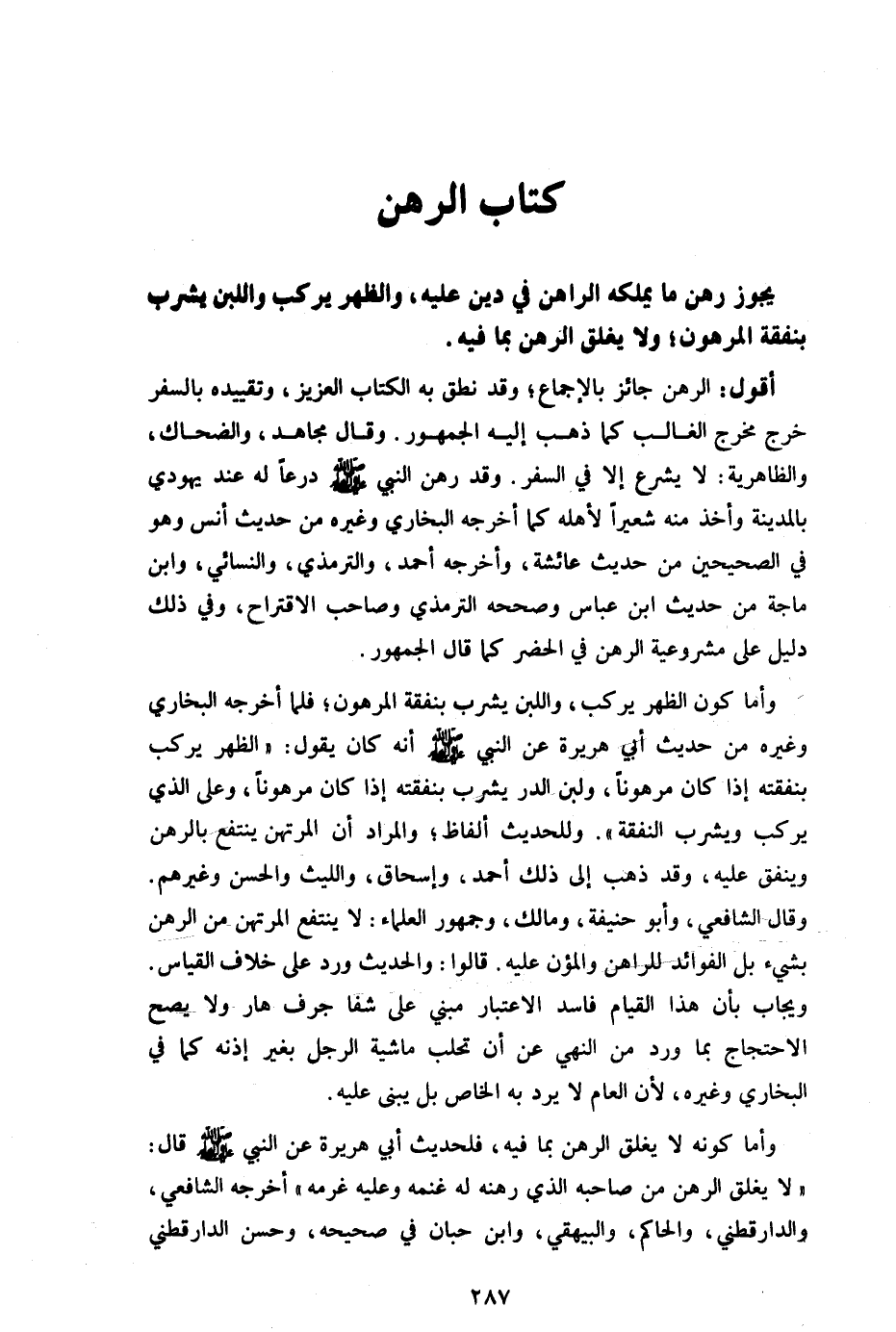 وأما كون الظهر يركب واللبن يشرب بنفقة المرهون فلما أخرجه البخاري وغيره من حديث أبي هريرة عن النبي صلى الله عليه وسلم أنه كان يقول: "الظهر يركب بنفقته إذا كان مرهونا ولبن الدر يشرب بنفقته إذا كان مرهونا وعلى الذي يركب ويشرب النفقة" وللحديث ألفاظ والمراد أن المرتهن ينتفع بالرهن وينفق عليه وقد ذهب إلى ذلك أحمد وإسحاق والليث والحسن وغيرهم وقال: الشافعي وأبو حنيفة ومالك وجمهور العلماء لا ينتفع المرتهن من الرهن بشيء بل الفوائد للراهن والمؤن عليه قالوا والحديث ورد على خلاف القياس ويجاب بأن هذا القياس فاسد الاعتبار مبني على شفا جرف هار ولا يصح الاحتجاج بما ورد من النهي عن أن تحلب ماشية الرجل بغير إذنه كما في البخاري وغيره لأن العام لا يرد به الخاص بل يبني عليه. وأما كونه لا يغلق الرهن بما فيه فلحديث أبي هريرة عن النبي صلى الله عليه وسلم قال: "لا يغلق الرهن من صاحبه الذي رهنه له غنمه وعليه غرمة" أخرجه الشافعي والدارقطني والحاكم والبيهقي وابن حبان في صحيحه وحسن الدارقطني