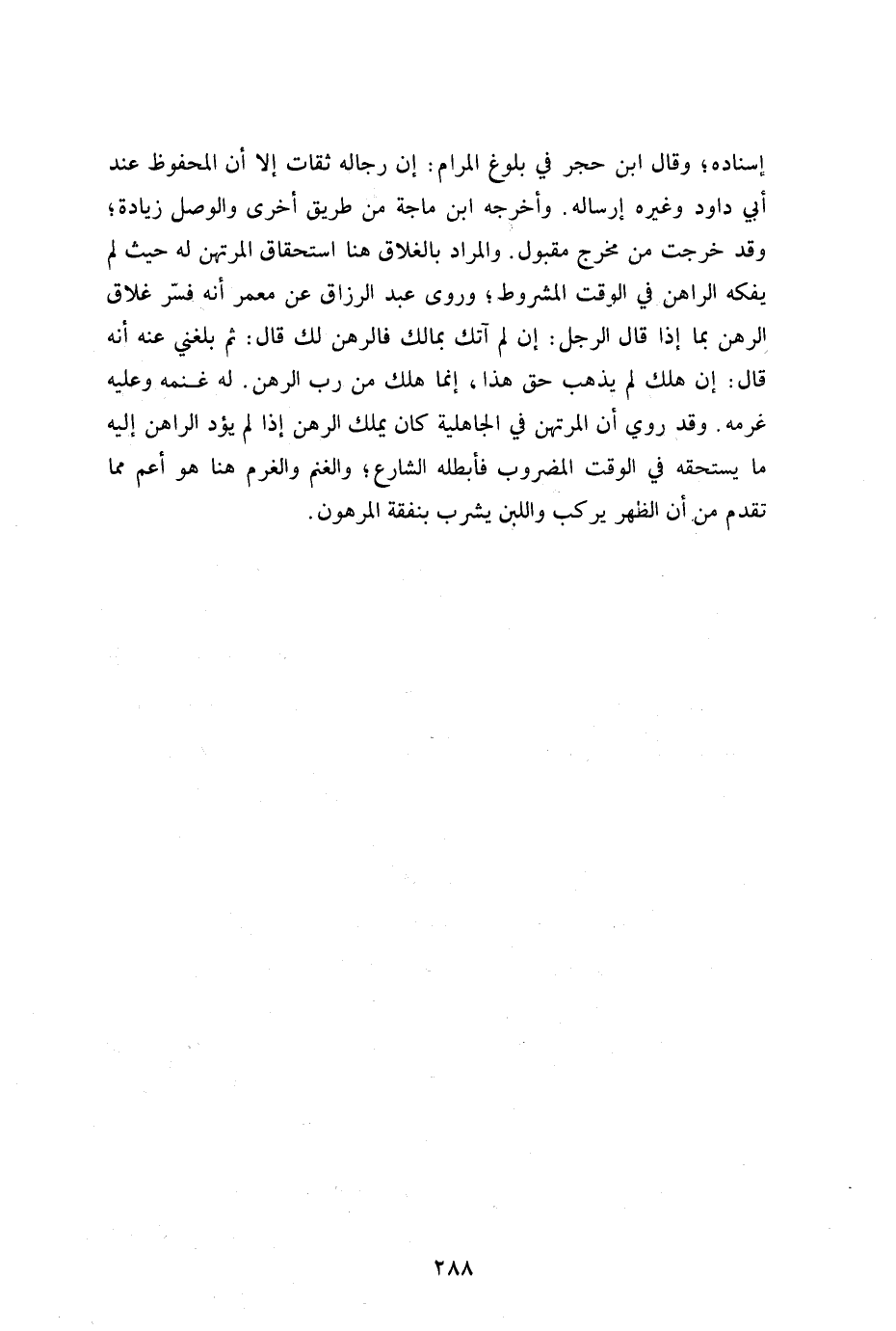 إسناده وقال: ابن حجر في بلوغ المرام إن رجاله ثقات إلا أن المحفوظ عند أبي داود وغيره إرساله وأخرجه ابن ماجه من طريق أخرى والوصل زيادة وقد خرجت من مخرج مقبول والمراد بالغلاق هنا استحقاق المرتهن له حيث لم يفكه الراهن في الوقت المشروط وروى عبد الرزاق عن معمر أنه فسر غلاق الرهن بما إذا قال: الرجل إن لم آتك بمالك فالرهن لك قال: ثم بلغني عنه أنه قال: إن هلك لم يذهب حق هذا إنما هلك من رب الرهن، له غنمه وعليه غرمه وقد روي أن المرتهن في الجاهلية كان يملك الرهن إذا لم يؤد الراهن إليه ما يستحقه في الوقت المضروب فأبطله الشارع والغنم والغرم هنا هو أعم مما تقدم من أن الظهر يركب واللبن يشرب بنفقة المرهون