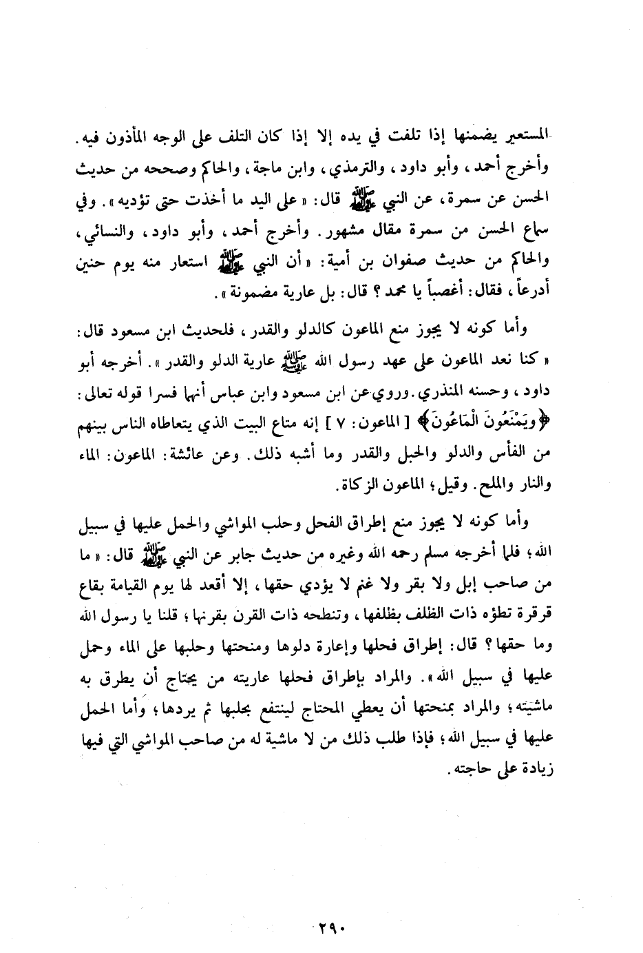 وأما كونه لا يجوز منع الماعون كالدلو والقدر فلحديث ابن مسعود قال: "كنا نعد الماعون على عهد رسول الله صلى الله عليه وسلم عارية الدلو والقدر" أخرجه أبوداود وحسنه المنذري وروى عن ابن مسعود وابن عباس أنهما فسرا قوله تعالى: {وَيَمْنَعُونَ الْمَاعُونَ} [الماعون:7] أنه متاع البيت الذي يتعاطاه الناس بينهم من الفأس والدلو والحبل الماعون الزكاة.