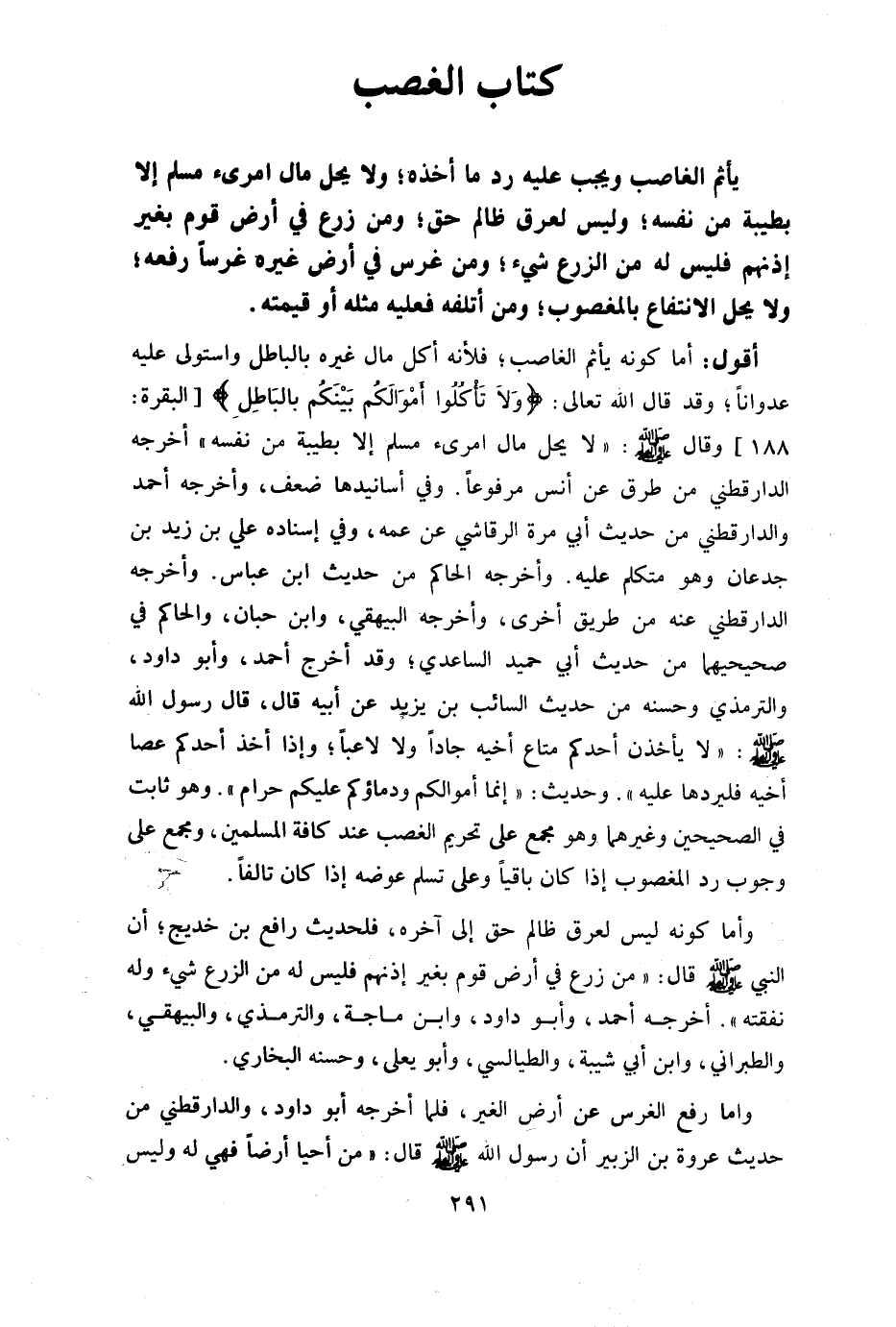 لا يأثم الغاضب ويجب عليه رد ماأخذه ولايحل مال امريء مسلم إلا بطيبة من نفسه وليس لعرق ظالم حق ومن زرعه في أرض قوم بغير إذنهم فليس له من الزرع شيء ومن غرس في أرض غيره غرسا رفعه ولايحل الإنتفاع بالمغضوب ومن اتلفه فعليه مثله أو قيمته