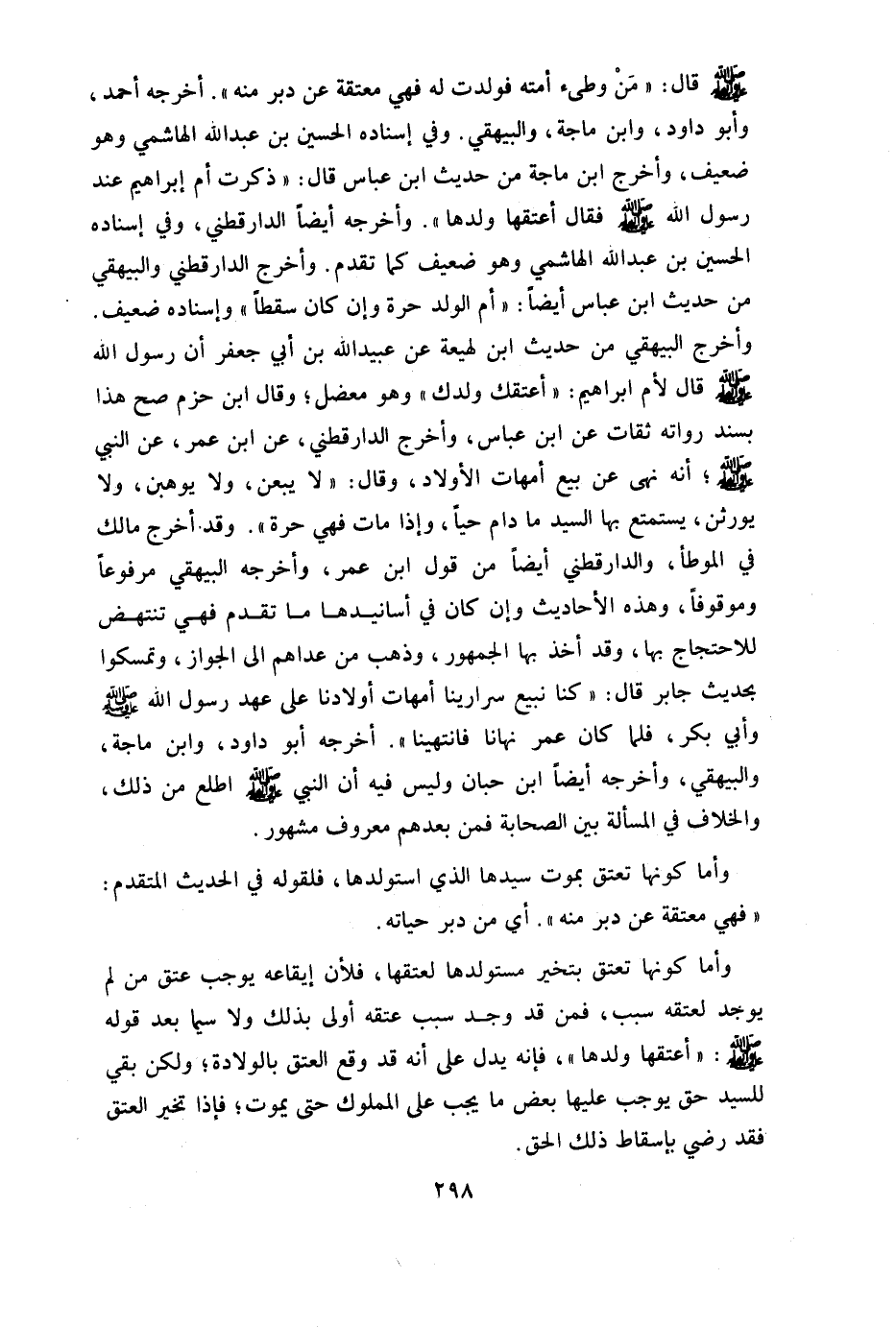 صلى الله عليه وسلم: "من وطئ أمته فولدت له فهي معتقة عن دبر منه" أخرجه أحمد وأبو داود وابن ماجه والبيهقي وفي إسناده الحسين بن عبد الله الهاشمي وهو ضعيف وأخرج ابن ماجه من حديث ابن عباس قال: ذكرت أم إبراهيم عند رسول الله صلى الله عليه وسلم فقال: أعتقها ولدها" وأخرجه أيضا الدارقطني وفي إسناده الحسين بن عبد الله الهاشمي وهو ضعيف كما تقدم وأخرج الدارقطني والبيهقي من حديث ابن عباس أيضا أم الولد حرة وإن كان سقطا" وإسناده ضعيف وأخرج البيهقي من حديث ابن لهيعة عن عبيد الله ابن أبي جعفر أن رسول الله صلى الله عليه وسلم قال لأم إبراهيم: "أعتق ولدك" وهو معضل وقال ابن حزم: صح هذا بسند رواته ثقات عن ابن عباس وأخرج الدارقطني عن ابن عمر عن النبي صلى الله عليه وسلم أنه نهى عن بيع أمهات الأولاد وقال: "لايبعن ولا يوهبن ولا يورثن يستمتع بها السيد مادام حيا وإذا مات فهي حرة" وقد أخرج مالك في المؤطأ والدارقطني أيضا من قول ابن عمر وأخرجه البيهقي مرفوعا وموقوفا وهذه الأحاديث وإن كان في إسانيدها ما تقدم فهي تنتهض للاحتجاج بها وقد أخذ بها الجمهور وذهب من عداهم إلى جواز وتمسكوا بحديث جابر قال: "كنا نبيع سرارينا أمهات أولادنا على عهد رسول الله صلى الله عليه وسلم وأبي بكر فلما كان عمر نهانا فانتهينا" أخرجه أبوداود وابن ماجه والبيهقي وأخرجه أيضا ابن حبان وليس فيه أن النبي صلى الله عليه وسلم اطلع على ذلك والخلاف في المسألة بين الصحابة فمن بعدهم معروف مشهور.