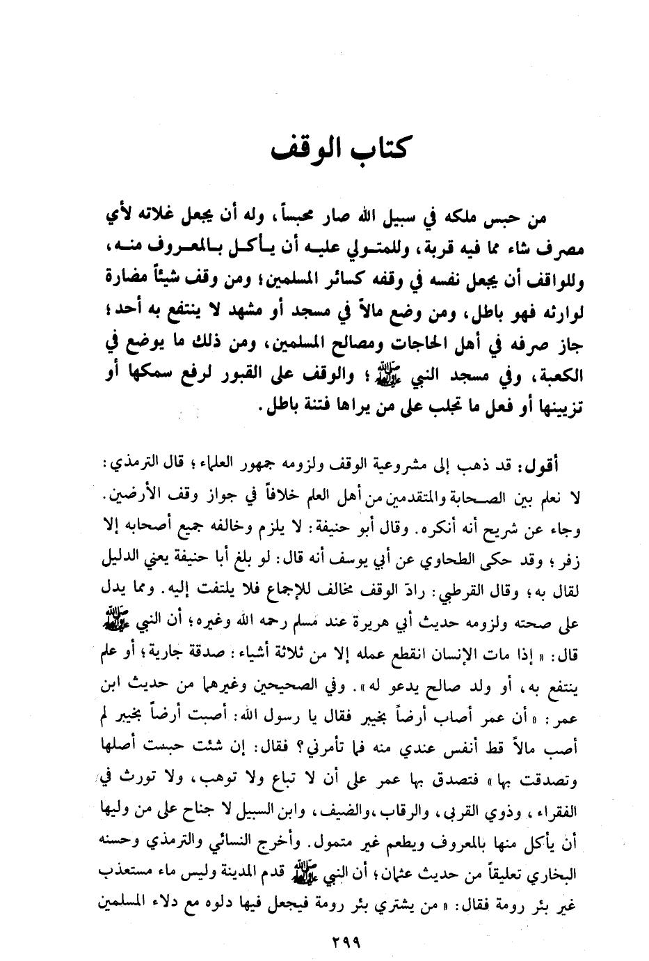 أقول: قد ذهب إلى مشروعيته الوقف ولزومه جمهور العلماء قال: الترمذي لا نعلم بين الصحابة والمتقدمين من أهل العلم خلافا في جواز وقف الأرضين وجاء عن شريح أنه أنكره وقال: أبو حنيفة لا يلزم وخالفه جميع أصحابه إلا زفر وقد حكى الطحاوى عن أبي يوسف أنه قال: لو بلغ أبا حنيفة يعني الدليل لقاء به وقال: القرطبي راد الوقف مخالف للإجماع فلا يلتفت إليه ومما يدل على صحته ولزومه حديث أبي هريرة عند مسلم رحمه الله وغيره أن النبي صلى الله عليه وسلم قال: "إذا مات الإنسان انقطع عمله إلا من ثلاثة أشياء صدقة جارية أو علم ينتفع به أو ولد صالح يدعوا له" وفي الصحيحين من حديث ابن عمر أن عمر أصاب أرضا بخبير فقال: يارسول الله أصبت أرضا بخبير لم أصب مالا قط أنفس عندي منه فما تأمرني فقال: "إن شئت حبست أصلها وتصدقت بها" فتصدق بها عمر على أن لا تباع ولا توهب ولا تورث في الفقراء وذوي القربى والرقاب والضيف وابن السبيل لا جناح على من وليها أن يأكل منها بالمعروف ويطعم غير متمول وأخرج النسائي والترمذي وحسنه البخاري تعليقا من حديث عثمان أن النبي صلى الله عليه وسلم قدم المدينة وليس فيها ماء مستعذب غير بئر رومة فقال: من يشتري بئر رومة فيجعل فيها دلوه مع دلاء المسلمين