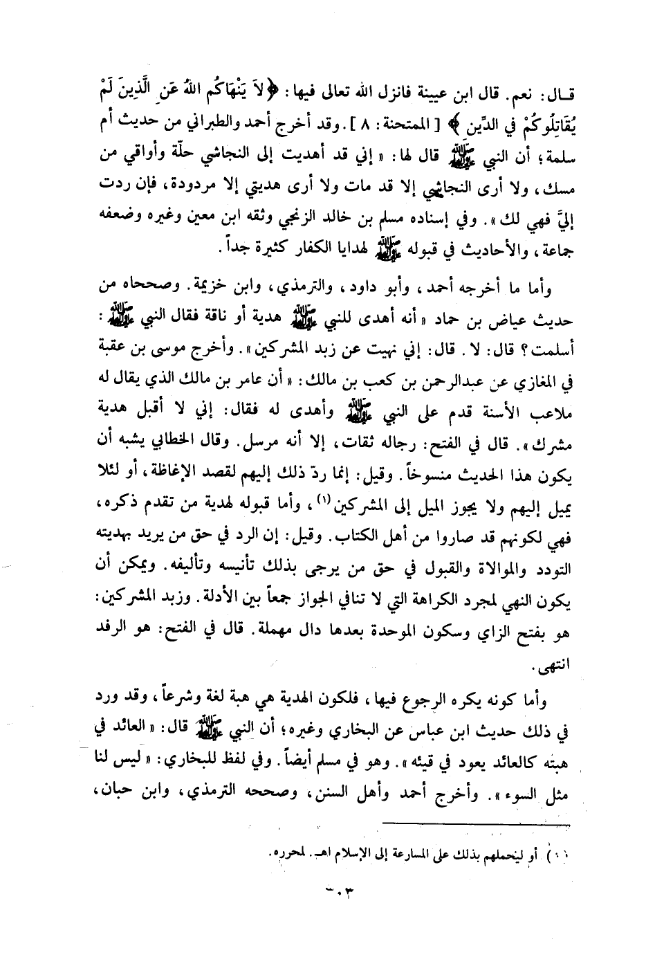 وأما ما أخرجه أحمد وأبو داود والترمذي وابن خزيمة وصححاه من حديث عياض بن حماد أنه أهدي للنبي صلى الله عليه وسلم هدية أو ناقة فقال النبي صلى الله عليه وسلم: "أسلمت قال: لا قال: إني نهيت عن زبد المشركين" وأخرج موسى بن عقبة في المغازي عن عبد الرحمن ابن كعب بن مالك أن عامر بن مالك الذي يقال له ملاعب الأسنة قدم على النبي صلى الله عليه وسلم وأهدى له فقال: "إني لا أقبل هدية مشرك" قال: في الفتح ورجاله ثقات إلا أنه مرسل وقال: الخطابي يشبه أن يكون هذا الحديث منسوخا وقيل إنما رد ذلك إليهم لقصد الإغاظة أو لئلا يميل إليهم ولا يجوز الميل إلى المشركين1، وأما قبوله لهدية من تقدم ذكره فهي لكونهم قد صاروا من أهل الكتاب وقيل إن الرد في حق من يريد بهديته التوود والمولاة والقبول في حق من يرجى لك تأنيسه وتأليفه ويمكن أن يكون النهي لمجرد الكراهة التي لا تنافي الحواز جمعا بين الأدلة وزبد المشركين هم بفتح الزاي وسكون الموحدة بعدها دال مهملة قال: في الفاتح هو الرفد انتهي.