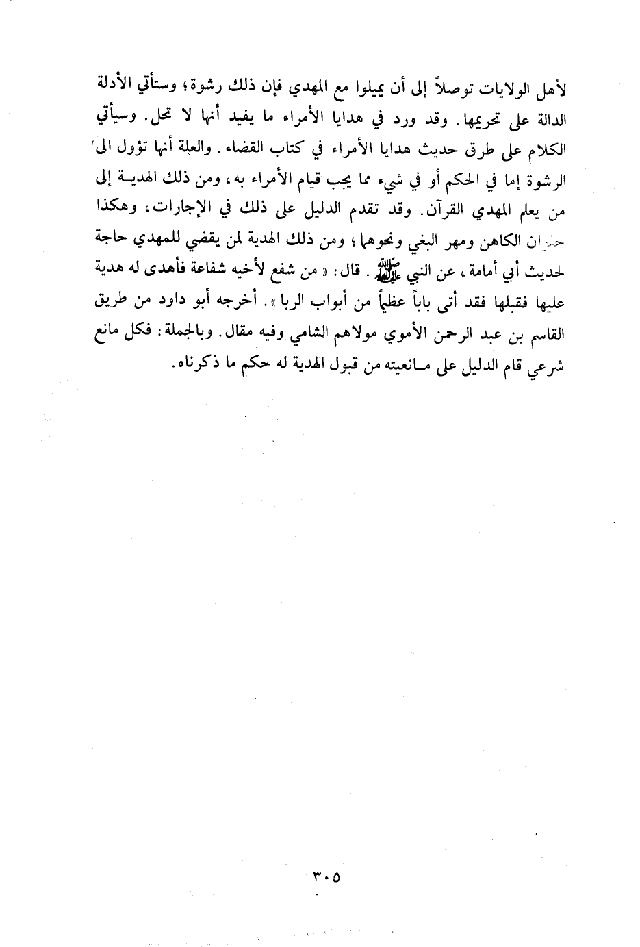 لأهل الولايات توصلا إلى أن يميلوا مع المهدي فإن ذلك رشوة وستأتي الأدلة على تحريمها وقد ورد في هدايا الأمراء مايفيد أنها لا تحل وسيأتي الكلام على طرق حديث هدايا الأمراء في كتاب القضاء والعلة أنها تئول إلى الرشوة إما في الحكم أو في شيء مما يجب قيام الأمراء به ومن ذلك الهدية إلى من يعلم المهدي القرآن وقد تقدم الدليل على ذلك في الإجارات وهكذا حلوان الكاهن ومهر البغي ونحوهما ومن ذلك الهدية لمن يقضي للمهدي حاجة لحديث أبي إمامة عن النبي صلى الله عليه وسلم قال: " من شفع لأخيه شفاعة فأهدي له هدية عليها فقبلها فقد أتى بابا عظيما من أبواب الربا" أخرجه أبو دواد من طريق القاسم ابن عبد الرحمن الأموي مولاهم الشامي وفيه مقال: وبالجملة فكل مانع شرعي قام الدليل على مانعيته من قبول الهدية له حكم ما ذكرناه.