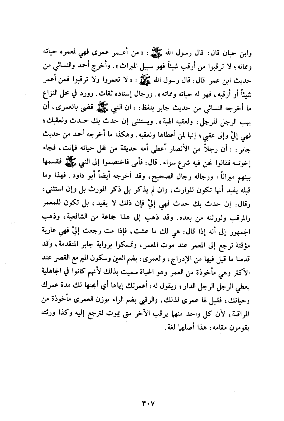وابن حبان قال: قال رسول الل صلى الله عليه وسلم: "من أعمر عمري فهي لمعمره حياته ومماته لاترقبوا من أرقب شيئا فهو سبيل الميراث" وأخرج أحمد والنسائي من حديث ابن عمر قال: قال رسول الله صلى الله عليه وسلم: "لا تعمروا ولا ترقبوا فمن أعمر شيئا أو أرقبه فهو له حياته ومماته" ورجال إسناده ثقات وورد في محل النزاع ما أخرجه النسائي من حديث جابر بلفظ أن النبي صلى الله عليه وسلم قضى بالعمري أن يهب الرجل للرجل ولعقبه الهبة" ويستنثى إن حدث بك حدث ولعقبك فهي إلي وإلى عقبي إنها لمن أعطاها ولعقبه وهكذا ما أخرجه أحمد من حديث جابر أن رجلا من الأنصار أعطى أمه حديقة من نخل حياتها فماتت فجاء إخوته فقالوا: نحن فيه شرع سواء قال: فأبى فاختصموا إلى النبي صلى الله عليه وسلم فقسمها بينهم ميراثا" ورجاله رجال الصحيح وقد أخرجه أيضا أبو داود فهذا وما قبله يفيد أنها تكون للوارث وإن لم يذكر بل ذكر الموورث بل وإن استثنى وقال: إن حدث بك حدث فهي إلي فإن ذلك لا يفيد بل تكون للمعمر والمرقب ولورثته من بعده وقد ذهب إلى هذا جماعة من الشافعية وذهب الجمهور إلى أنه إذا قال: هي لك ما عشت فإذا مت رجعت إلي فهي عارية مؤقتة ترجع إلى المعمر عند موت المعمر وتمسكوا برواية جابر المتقدمة وقد قدمنا ماقيل فيها من الإدارج والعمرى بضم العين وسكون الميم مع القصر عند الأكثر وهي مأخوذة من العمر وهو الحياة سميت بذلك لأنهم كانوا في الجاهلية يعطي الرجل الرجل الدار ويقول له أعمرتك أياها أي أبحتها لك مدة عمرك وحياتك فقيل لها عمرى لذلك والرقبى بضم الراء بوزن العمري مأخوذة من الرقبة لأن كل واحد منهما يرقب الآخر متى يموت لترجع إليه وكذا ورثته يقومون مقامه هذا أصلهما لغة.