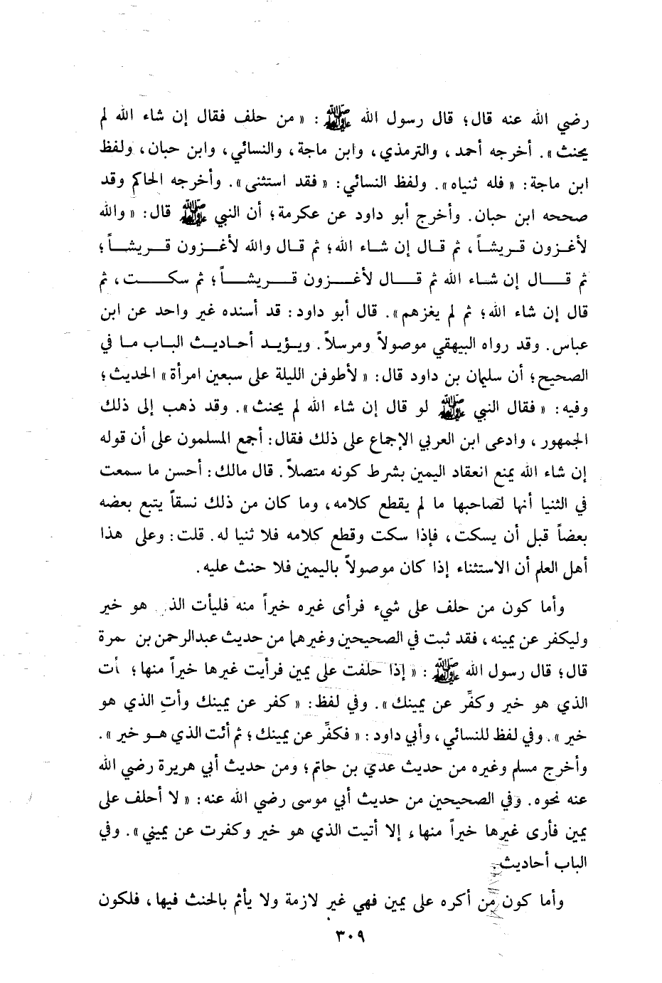 رضي الله عنه قال: قال رسول الله صلى الله عليه وسلم: "من حلف فقال إن شاء الله لم يحنث" أخرجه أحمد والترمذي وابن ماجه والنسائي وابن حبان ولفظ ابن ماجه "فله ثنياه" ولفظ النسائي "فقد استثنى" وأخرجه الحاكم وقد صححه ابن حبان وأخرج أبو داود عن عكرمة أن النبي صلى الله عليه وسلم قال: "والله لأغزون قريشا ثم قال: إن شاء الله ثم قال: والله لأغزون قريشا ثم قال: إن شاء الله ثم قال: والله لأغزون قريشا ثم سكت ثم قال: إن شاء الله ثم لم يغزهم" قال: أبو داود قد أسنده غير واحد عن ابن عباس وقد رواه البيهقي موصلا ومرسلا ويؤيد أحاديث الباب ما في الصحيح أن سليمان ابن داود قال: "لأطوفن الليلة على سبعين امرأة" الحديث وفيه "فقال النبي صلى الله عليه وسلم: "لو قال إن شاء الله لم يحنث" وقد ذهب إلى ذلك الجمهور وادعى ابن العربي الإجماع على ذلك فقال: أحمع المسلمون على أن قوله: إن شاء الله يمنع انعقاد اليمين بشرط كونه متصلا قال مالك: أحسن ما سمعت في الثنيا أنها لصاحبها ما لم يقطع كلامه وما كان من ذلك نسقا يتبع بعضه بعضا قبل أن يسكت فإذا سكت وقطع كلامه فلا ثنيا له قلت وعلى هذا أهل العلم أن الاستثناء إذا كان موصولا باليمين فلا حنث عليه.