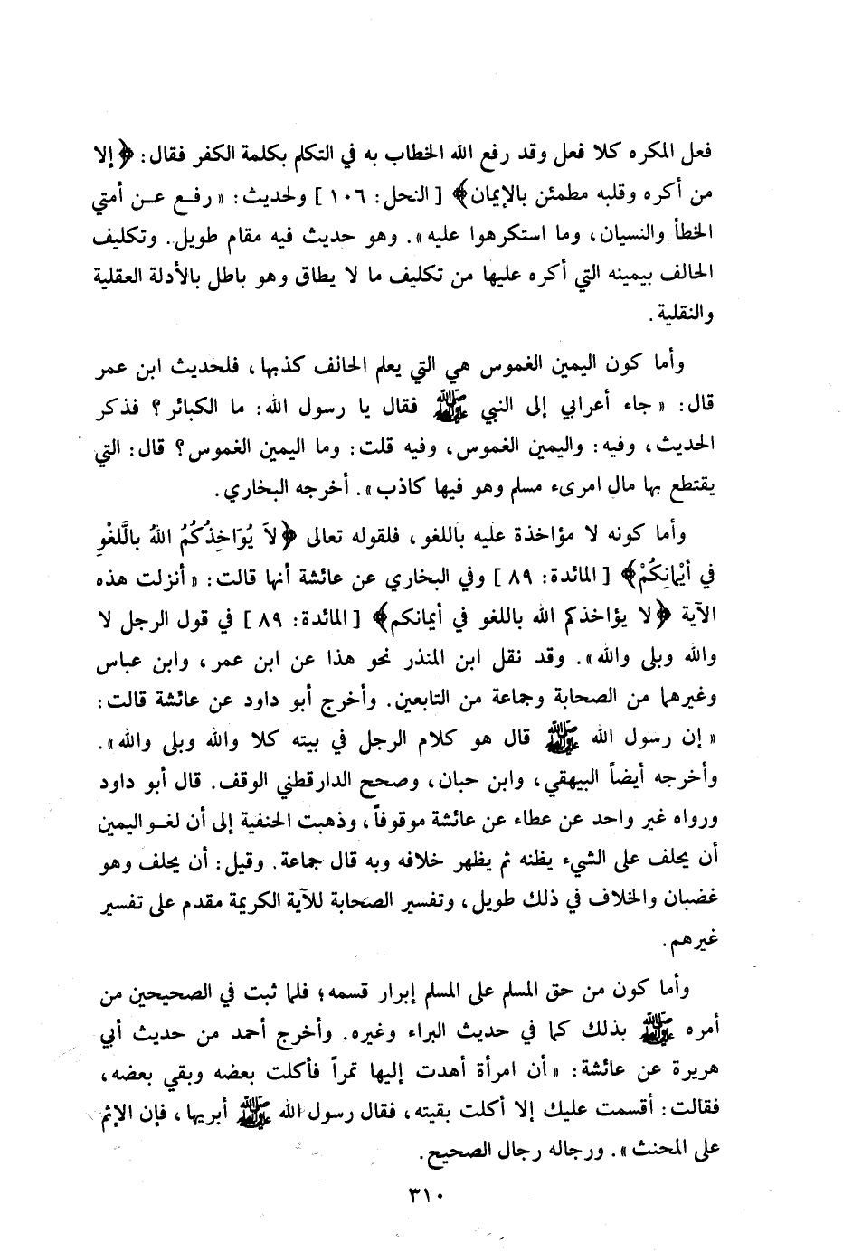وأما كونه لا مؤاخذة عليه باللغو فلقوله تعالى: {لَا يُؤَاخِذُكُمُ اللَّهُ بِاللَّغْوِ فِي أَيْمَانِكُمْ} وفي البخاري عن عائشة أنها قالت: أنزلت هذه الآية: {لَا يُؤَاخِذُكُمُ اللَّهُ بِاللَّغْوِ فِي أَيْمَانِكُمْ} في قول الرجل: لا والله وبلى والله وقد نقل ابن المنذر نحو هذا عن ابن عمر وابن عباس وغيرهما من الصحابة وجماعة من التابعين وأخر ج أبو داود عن عائشة قالت: "إن رسول الله صلى الله عليه وسلم قال: " هو كلام الرجل في بيته كلا والله وبلى والله" وأخرجه أيضا البيهقى وابن حبان وصحح الدارفطنى الوقف قال أبو داود: رواه غير واحد عن عطاء عن عائشة موقوفا وذهب الحنفية إلى أن لغو اليمين أن يحلف على الشي يظنه ثم يظهر خلافه وبه قال: جماعة وقيل أن يحلف وهو غضبان والخلاف في ذلك طويل وتفسير الصحابة للآية الكريمة مقدم على تفسير غيرهم.
