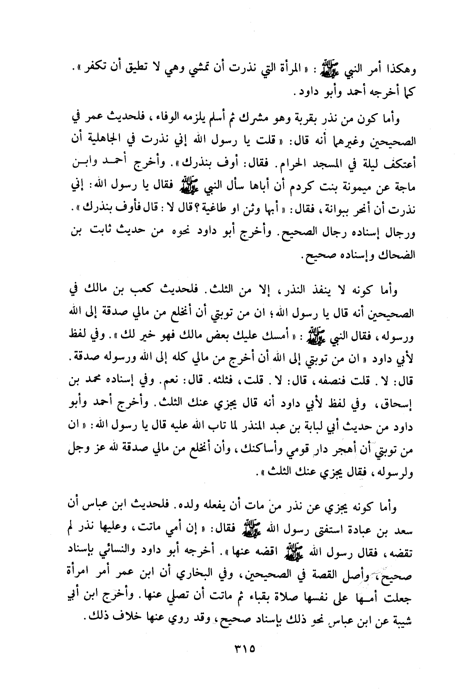 وأما كونه لا ينفذ النذر إلا من الثلث فلحديث كعب بن مالك فب الصحيحين أنه قال: يا رسول الله "إن من توبتى أن أنخلع من مالي صدقة إلى الله ورسوله فقال النبي صلى الله عليه وسلم أمسك عليك بعض مالك فهو خير لك" وفي لفظ لأبي داود إن من توبتي إلى الله أن أخرج من مالي كله إلى الله ورسوله صدقة قال: لا قلت فنصفه قال: لا قلت فثلثه قال: "نعم" وفي إسناده محمد بن إسحاق وفي لفظ لأبي داود أنه قال: "يجزى عنك الثلث" وأخرج أحمد وأبو داود من حديث أبي لبابة بن عبد المنذر لما تاب الله عليه قال: يا رسول الله "إن من توبتي أن أهجر دار قومي وأساكنك وأن أنخلع من مالي صدقة لله عز وجل ولرسوله فقال: يجزى عنك الثلث".