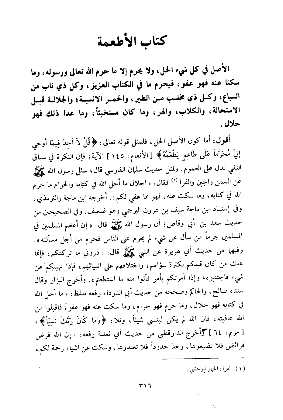 أقول: أما كون الأصل الحل فلمثل قوله تعالى: {قُلْ لا أَجِدُ فِي مَا أُوحِيَ إِلَيَّ مُحَرَّماً عَلَى طَاعِمٍ يَطْعَمُهُ} الآية فإن النكرة في سياق النفي تدل على العموم ولمثل حديث سلمان الفارسي قال: سئل رسول الله صلى الله عليه وسلم عن السمن والجبن والفرا فقال: "الحلال ما أحل الله في كتابه والحرام ما حرم الله في كتابه وما سكت عنه فهو مما عفى لكم" أخرجه ابن ماجه والترمذي وفي إسناد ابن ماجه سيف بن هرون البرجمى وهو ضعيف وفي الصحيحين من حديث سعد بن أبي وقاص أن رسول الله صلى الله عليه وسلم قال: " إن أعظم المسلمين في المسلمين جرما من سأل عن شيء لم يحرم على الناس فحرم من أجل مسألته" وفيهما من حديث أبي هريرة عن النبي صلى الله عليه وسلم قال: "ذروني ما تركتكم فإنما هلك من كان قبلكم بكثرة سؤالهم واختلافهم على أنبيائهم فإذا نهيتكم عن شيء فاجتنبوه وإذا أمرتكم بأمر فأتوا منه ما استطعتم" وأخرج البزار وقال: سنده صالح والحاكم وصححه من حديث أبي الدرداء رفعه بلفظ "ما أحل الله في كتابه فهو حلال وما حرم فهو حرام وما سكت عنه فهو عفو فاقبلوا من الله عافيته فإن الله لم يكن لينسى شيئا وتلا {وَمَا كَانَ رَبُّكَ نَسِيّاً} [مريم:64] " وأخرج الدار قطنى من حديث أبي ثعلبة رفعه: "إن الله فرض فرائض فلا تضيعوها وحد حدودا فلا تعتدوها وسكت عن أشياء رحمة لكم,