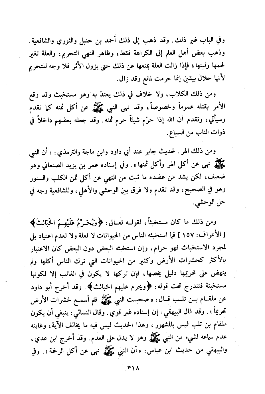 ومن ذلك ما كان مستخبثا لقوله تعالى: {وَيُحَرِّمُ عَلَيْهِمُ الْخَبَائِثَ} [لأعراف:157] فما استخبثه الناس من الحيوانات لا لعلة ولا لعدم اعتياد بل لمجرد الاستخباث فهو حرام وإن استخبثه البعض دون البعض كان الاعتبار بالأكثر كحشرات الأرض وكثير من الحيوانات التي ترك الناس أكلها ولم ينهض على تحريمها دليل يخصها فإن تركها لا يكون في الغالب إلا لكونها مستخبثة فتندرج تحت قوله: {وَيُحَرِّمُ عَلَيْهِمُ الْخَبَائِثَ} وقد أخرج أبو داود عن ملقام بن تلب قال: "صحبت النبي صلى الله عليه وسلم فلم أسمع لحشرات الأرض تحريما" وقد قال: البيهقى إن إسناده غير قوي وقال: النسائي ينبغى أن يكون ملقام بن تلب ليس بالمشهور وهذا الحديث ليس فيه ما يخالف الآية وغايته عدم سماعه لشيء من النبي صلى الله عليه وسلم وهو لا يدل على العدم وقد أخرج ابن عدى والبيهقى من حديث ابن عباس "أن النبي صلى الله عليه وسلم نهى عن أكل الرخمة" وفي