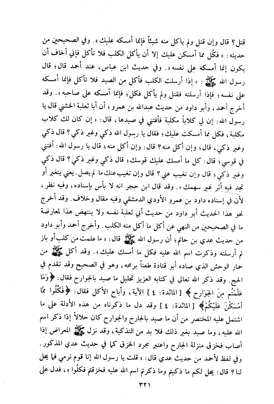قتل؟ قال: وإن قتل ولم يأكل منه شيئا فإنما أمسكه عليك" وفي الصحيحين من حديثه "فكل مما أمسكن عليك إلا أن يأكل الكلب فلا تأكل فإنى أخاف أن يكون إنما أمسكه على نفسه" وفي حديث ابن عباس عند أحمد قال: قال رسول الله صلى الله عليه وسلم: "إذا أرسلت الكلب فأكل من الصيد فلا تأكل إنما أمسكه على نفسه فإذا أرسلته فقتل ولم يأكل فكل فإنما أمسكه على صاحبه" وقد أخرج أحمد وأبو داود من حديث عبد الله ابن عمرو أن أبا ثعلبة الخشنى قال: يا رسول الله إن لي كلابا مكلبة فأفتنى في صيدها قال: إن كان لك كلاب مكلبة فكل مما أمسكت عليك فقال: يا رسول الله ذكي وغير ذكي؟ قال: ذكي وغير ذكي قال: وإن أكل منه قال: "وإن أكل منه" قال: يا رسول الله افتنى في قوسي قال: كل ما أمسك عليك قوسك قال: ذكي وغير ذكي؟ قال: "ذكي وغير ذكي" قال: وإن تغيب عني؟ قال: "وإن تغيب عنك ما لم يصل يعني يتغير أو تجد فيه أثر غير سهمك" وقد قال: ابن حجر أنه لا بأس بإسناده وفيه نظر لأن في إسناده داود بن عمرو الأودي الدمشقى وفيه مقال: وخلاف وقد أخرج نحو هذا الحديث أبو داود من حديث أبي ثعلبة نفسه ولا ينتهض هذا لمعارضة ما في الصحيحين من النهى عن أكل ما أكل منه الكلب وأخرج أحمد وأبو داود من حديث عدى بن حاتم أن رسول الله صلى الله عليه وسلم قال: " ما علمت من كلب أو باز ثم أرسلته وذكرت اسم الله عليه فكل ما أمسك عليك" وقد أكل صلى الله عليه وسلم من حمار الوحش الذى صاده أبو قتادة طعنا برمحه وهو في الصحيح وقد تقدم في الحج وقد ذكر الله تعالى في كتابه العزيز تحليل ما صيد بالجوارح فقال: {وَمَا عَلَّمْتُمْ مِنَ الْجَوَارِحِ} [المائدة:4] الآية وأباح الأكل فقال: {فَكُلُوا مِمَّا أَمْسَكْنَ عَلَيْكُمْ} وقد دل ما ذكرناه من هذه الأدلة على ما اشتمل عليه المختصر من أن ما صيد بالجارح والجوارح كان حلالا إذا ذكر اسم الله عليه وما صيد بغير ذلك فلا بد من التذكية وقد نزل صلى الله عليه وسلم المعراض إذا أصاب فخزق منزله الجارح واعتبر مجرد الخزق كما في حديث عدي المذكور وفي لفظ لأحمد من حديث عدي قال: قلت يا رسول الله إنا قوم نرمى فما يحل لنا قال: يحل لكم ما ذكيتم وما ذكرتم اسم الله عليه فخزقتم فكلوا" فدل على