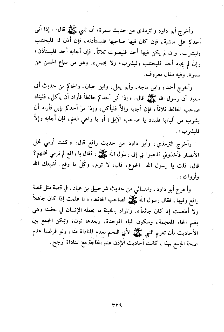 وأخرج أحمد وابن ماجه وأبو يعلى وابن حبان والحاكم من حديث أبي سعيد أن رسول الله صلى الله عليه وسلم قال: "إذا أتى أحدكم حائطا فأراد أن يأكل فليناد صاحب الحائط ثلاثا فإن أجابه وإلا فليأكل وإذا مر أحدكم بإبل فأراد أن يشرب من ألبانها فليناد يا صاحب الإبل أو ياراعى الغنم فإن أجابه وإلا فليشرب". وأخرج الترمذي وأبو داود من حديث رافع قال: كنت أرمي نخل الأنصار فأخذوني فذهبوا بي إلى رسول الله صلى الله عليه وسلم فقال: "يا رافع لم ترم نخلهم"؟ قال: قلت يا رسول الله الجوع قال: "لا ترم وكل ما وقع أشبعك الله وأرواك".