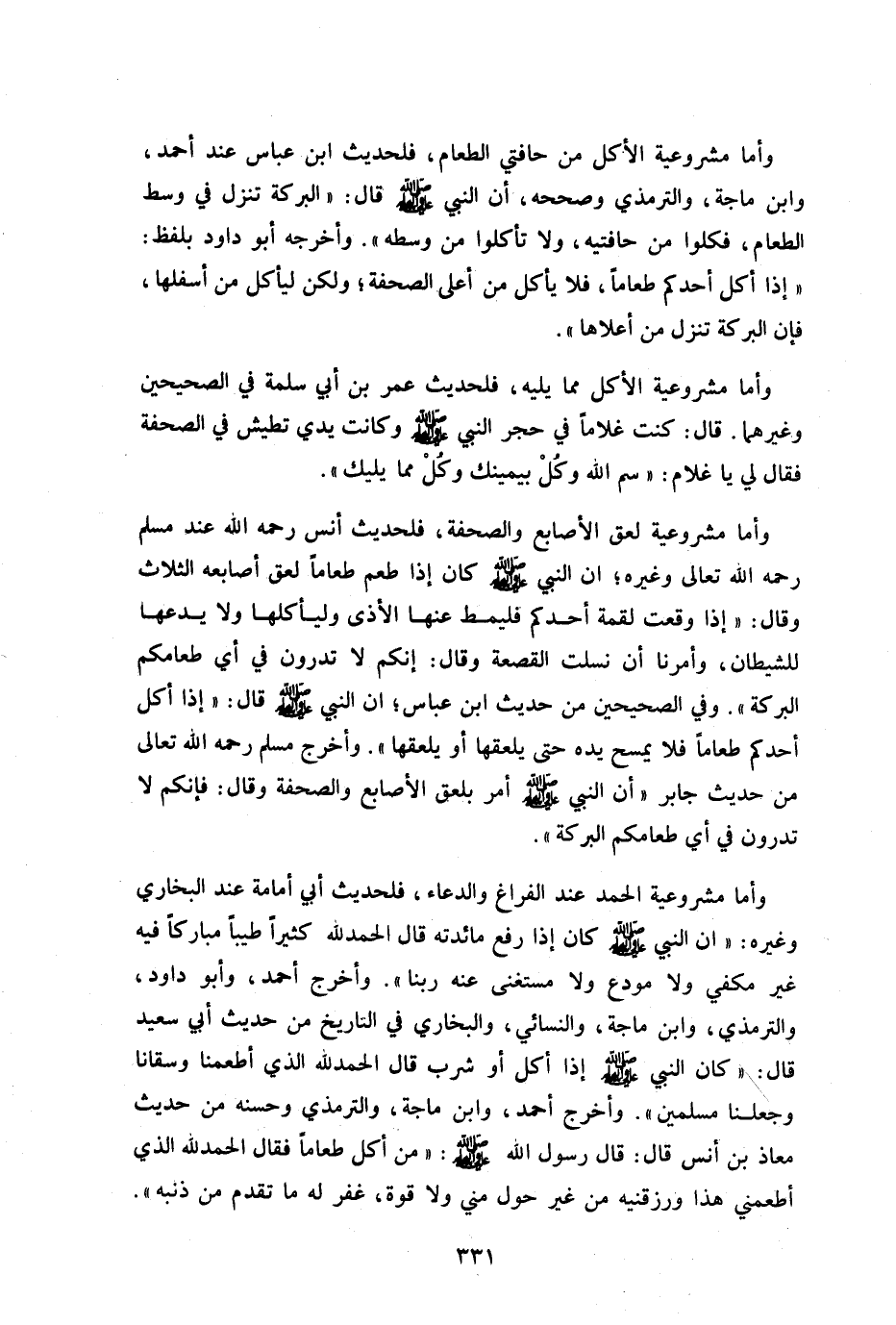 وأما مشروعية الأكل من حافتي الطعام فلحديث ابن عباس عند أحمد وابن ماجه والترمذي وصححه أن النبي صلى الله عليه وسلم قال: "البركة تنزل في وسط الطعام فكلوا من حافتيه ولا تاكلوا من وسطه" وأخرجه أبو داود بلفظ "إذا أكل أحدكم طعاما فلا يأكل من أعلى الصفحة ولكن ليأكل من أسفلها فإن البركة تنزل من أعلاها".