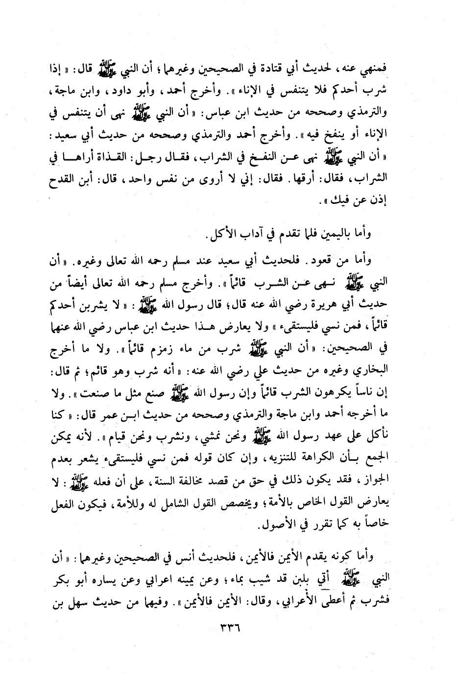 فمنهى عنه" لحديث أبي قتادة في الصحيحين وغيرهما أن النبي صلى الله عليه وسلم قال: "إذا شرب أحدكم فلا يتنفس في الإناء" وأخرج أحمد وأبو داود وابن ماجه والترمذي وصححه من حديث ابن عباس أن النبي صلى الله عليه وسلم نهى أن يتنفس في الإناء أو ينفخ فيه" وأخرج أحمد والترمذي وصححه من حديث أبي سعيد أن النبي نهى عن النفخ في الشراب فقال: رجل القذاة أراها في الشراب؟ فقال: أرقها فقال: إنى لا أروى من نفس واحد قال: أبن القدح إذن عن فيك".
