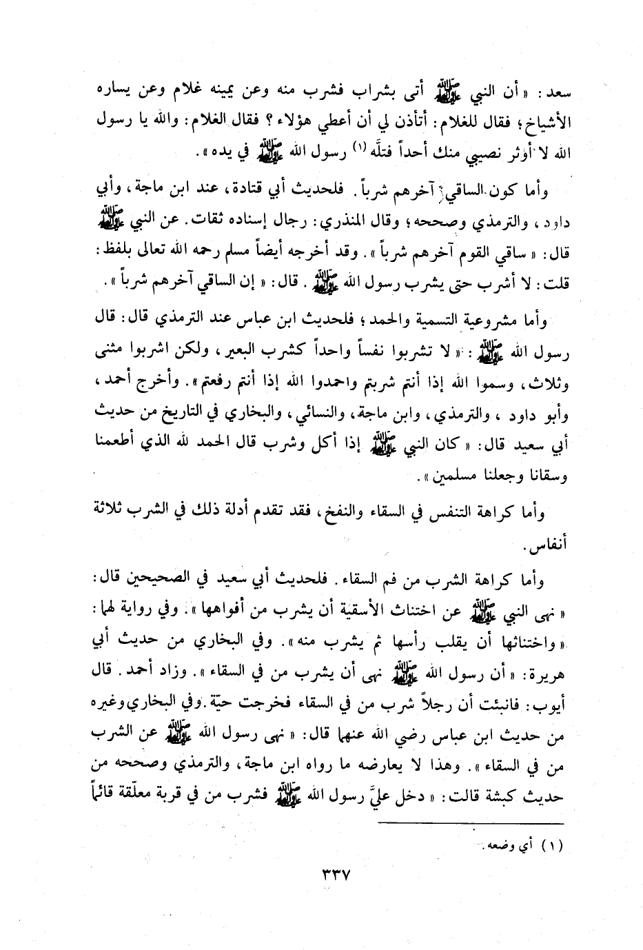 وأما مشروعية التسمية والحمد فلحديث ابن عباس عند الترمذي قال: قال رسول الله صلى الله عليه وسلم: "لا تشربوا نفسا واحدا كشرب البعير ولكن اشربوا مثنى وثلاث وسموا الله إذا أنتم شربتم واحمدوا الله إذا أنتم رفعتم" وأخرج أحمد وأبو داود والترمذي وابن ماجه والنسائي والبخارى في التاريخ من حديث أبي سعيد قال: كان النبي صلى الله عليه وسلم إذا أكل وشرب قال: "الحمد لله الذى أطعمنا وسقانا وجعلنا مسلمين".