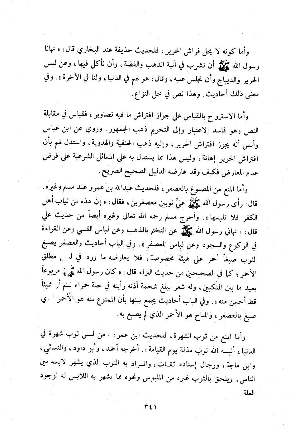 وأما كونه لا يحل فراش الحرير فلحديث حذيفة عند البخارى قال: نهانا رسول الله صلى الله عليه وسلم أن نشرب في آنية الذهب والفضة وأن نأكل فيها وعن لبس الحرير والديباج وأن نجلس عليه وقال: "هو لهم في الدنيا ولنا في الآخرة" وفي معنى ذلك أحاديث وهذا نص في محل النزاع.