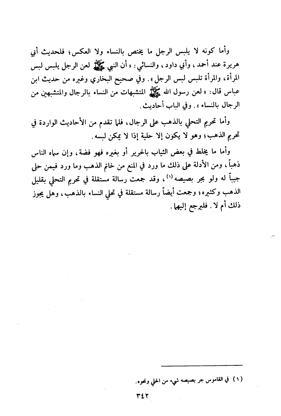 وأما كونه لا يلبس الرجل ما يختص بالنساء ولا العكس فلحديث أبي هريرة عند أحمد وأبي داود والنسائي أن النبي صلى الله عليه وسلم لعن الرجل يلبس لبس المرأة والمرأة تلبس لبس الرجل" وفي صحيح البخارى وغيره من حديث ابن عباس قال: لعن رسول الله صلى الله عليه وسلم المتشبهات من النساء بالرجال والمتشبهين من الرجال بالنساء" وفي الباب أحاديث.