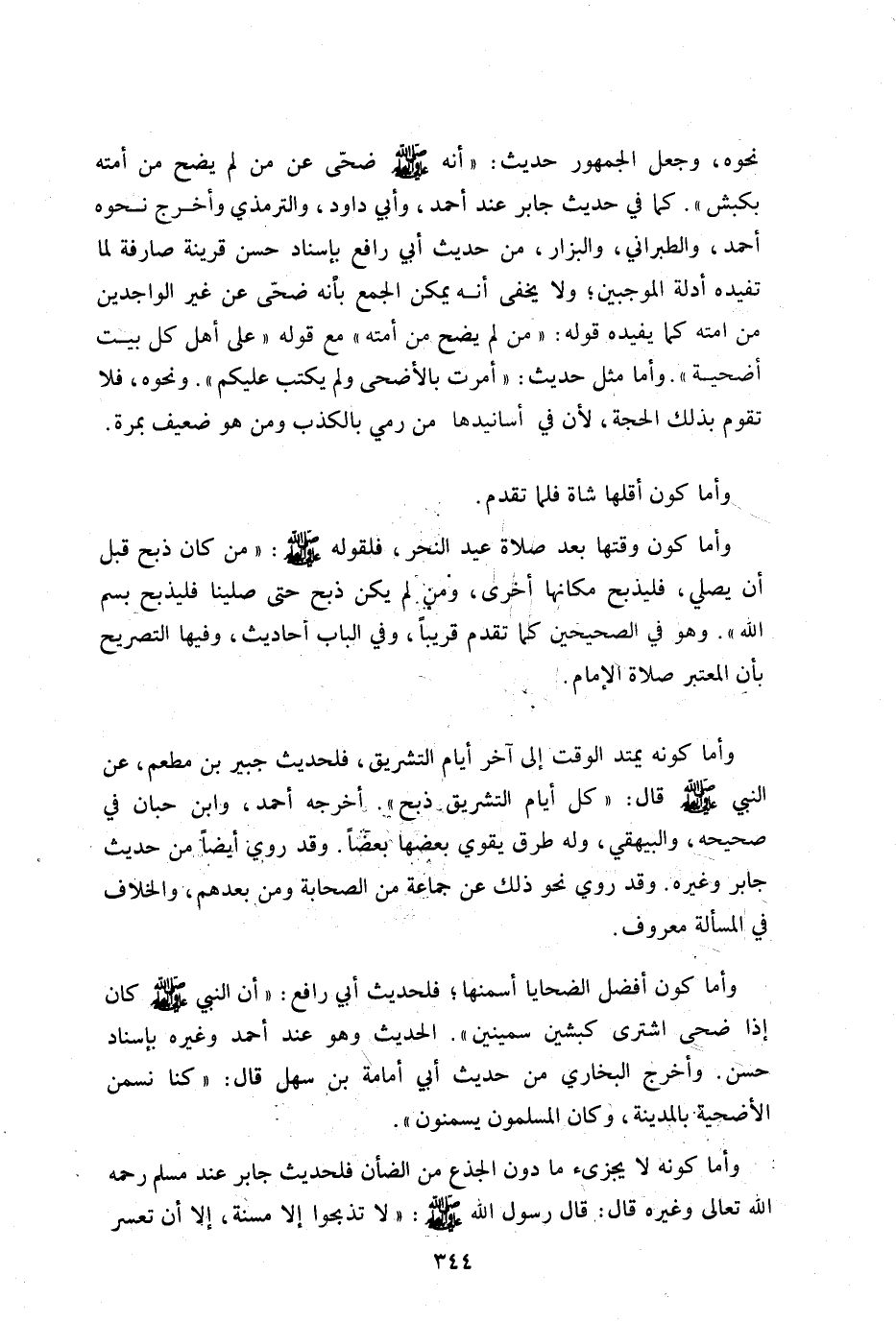 نحوه وجعل الجمهور حديث أنه صلى الله عليه وسلم ضحى عن من لم يضح من أمته بكبش" كما في حديث جابر عند أحمد وأبي داود والترمذي وأخرج نحوه أحمد والطبراني والبزار من حديث أبي رافع بإسناد حسن قرينة صارفة لما تفيده أدلة الموجبين ولا يخفى أنه يمكن الجمع بأنه ضحى عن غير الواجدين من أمته كما يفيده قوله: "من لم يضح من أمته مع قوله: "على كل أهل بيت أضحية" وأما مثل حديث "أمرت بالأضحى ولم يكتب عليكم" ونحوه فلا تقوم بذلك الحجة لأن في أسانيدها من رمي بالكذب ومن هو ضعيف بمرة.