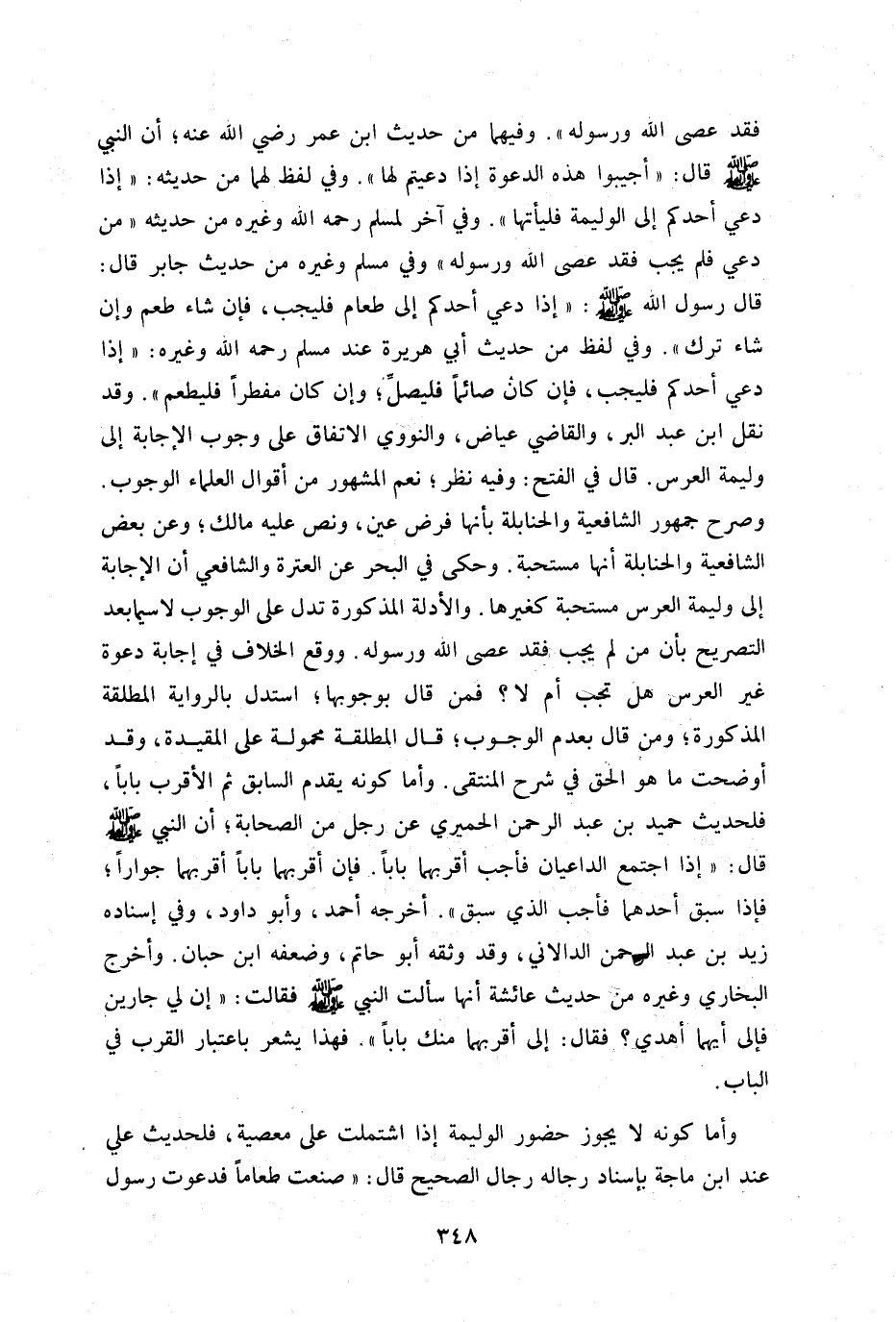 فقد عصى الله ورسوله" وفيهما من حديث ابن عمر رضي الله عنه أن النبي صلى الله عليه وسلم قال: "أجيبوا هذه الدعوة إذا دعيتم لها" وفي لفظ لهما من حديثه "إذا دعى أحدكم إلى الوليمة فليأتها" وفي آخر لمسلم رحمه الله وغيره من حديثه "من دعي فلم يجب فقد عصى الله ورسوله" وفي مسلم وغيره من حديث جابر قال: قال رسول الله صلى الله عليه وسلم: "إذا دعي أحدكم إلى طعام فليجب فإن شاء طعم وإن شاء ترك" وفي لفظ من حديث أبي هريرة عند مسلم رحمه الله وغيره "إذا دعي أحدكم فليجب فإن كان صائما فليصل وإن كان مفطرا فليطعم" وقد نقل ابن عبد البر والقاضى عياض والنووي الإتفاق على وجوب الإجابة إلى وليمة العرس قال: في الفتح وفيه نظر نعم المشهور من أقوال العلماء الوجوب وصرح جمهور الشافعية والحنابلة بأنها فرض عين ونص عليه مالك وعن بعض الشافعية والحنابلة أنها مستحبة وحكى في البحر عن العترة الشافعي أن الإجابة إلى وليمة العرس مستحبة كغيرها والأدلة المذكورة تدل على الوجوب لا سيما بعد التصريح بأن من لم يجب فقد عصى الله ورسوله ووقع الخلاف في إجابة دعوة غير العرس هل تجب أم لا؟ فمن قال: بوجوبها استدل بالرواية المطلقة المذكورة ومن قال: بعدم الوجوب قال: المطلقة محمولة على المقيدة وقد أوضحت ما هو الحق في شرح المنتقى وأما كونه يقدم السابق ثم الأقرب بابا فلحديث حميد ابن عبد الرحمن الحميري عن رجل من الصحابة أن النبي صلى الله عليه وسلم قال: "إذا احتمع الداعيان فأجب أقربهما بابا فإن أقربهما بابا أقربهما جوارا فإذا سبق أحدهما فأجب الذى سبق" أخرجه أحمد وأبو داود وفي إسناده زيد ابن عبد الرحمن الدالانى وقد وثقه أبو حاتم وضعفه ابن حبان وأخرج البخاري وغيره من حديث عائشة أنها سألت النبي صلى الله عليه وسلم فقالت: "إن لي جارين فإلى أيهما أهدي فقال: إلى أقربهما منك بابا" فهذا يشعر باعتبار القرب في الباب.