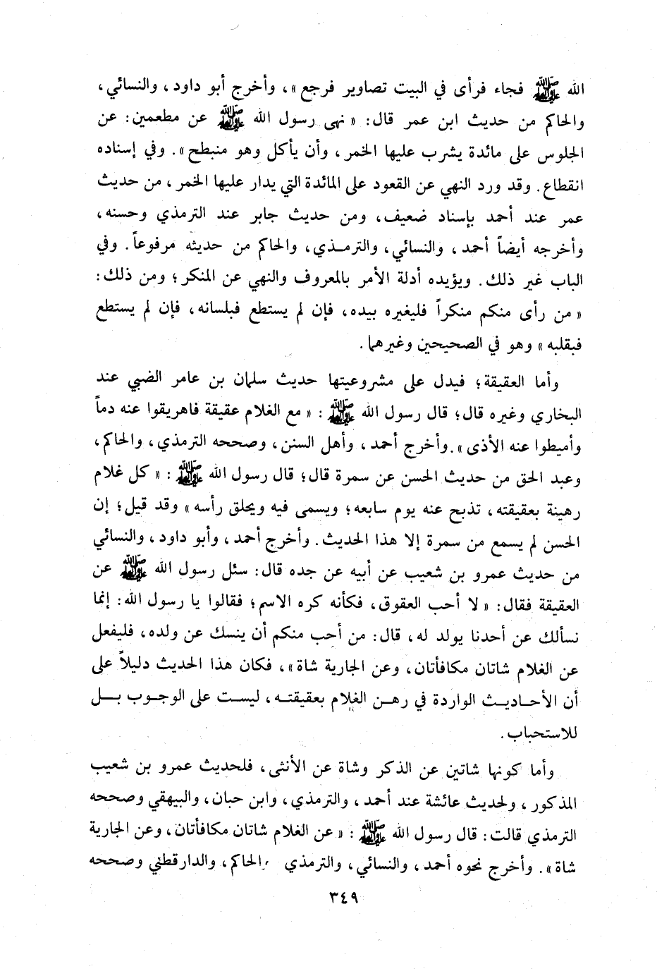 وأما العقيقة فيدل على مشروعيتها حديث سلمان بن عامر الضبي عند البخاري وغيره قال: قال رسول الله صلى الله عليه وسلم: "مع الغلام عقيقة فأهرقوا عنه دما وأميطوا عنه الأذى" وأخرج أحمد وأهل السنن وصححه الترمذى والحاكم وعبد الحق من حديث الحسن عن سمرة قال: قال رسول الله صلى الله عليه وسلم: "كل غلام رهينة بعقيقته تذبح عنه يوم سابعه ويسمى فيه ويحلق ر أسه" وقد قيل أن الحسن لم يسمع من سمرة إلا هذا الحديث وأخرج أحمد وأبو داود والنسائي من حديث عمرو بن شعيب عن أبيه عن جده قال: "سئل رسول الله صلى الله عليه وسلم عن العقيقة فقال: لا أحب العقوق فكأنه كره الإسم فقالوا: يا رسول الله إنما نسألك عن أحدنا يولد له قال: "من أحب منكم أن ينسك عن ولده فليفعل عن الغلام شاتان مكافأتان وعن الجارية شاه" فكان هذا الحديث دليلا على أن الأحاديث الواردة في رهن الغلام بعقيقته ليست على الوجوب بل للاستحباب.