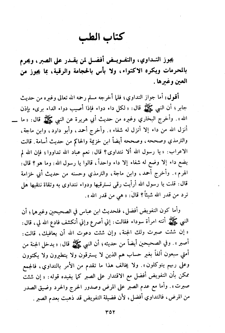 وأما كون التفويض أفضل فلحديث ابن عباس في الصحيحين وغيرهما أن النبي صلى الله عليه وسلم أتته امرأة سوداء فقالت: إ ني أصرع وإني أنكشف فادع الله لي قال: إن شئت صبرت ولك الجنة وإن شئت دعوت الله أن يعافيك قالت:: أصبر" وفي الصحيحين أيضا من حديثه أن النبي صلى الله عليه وسلم قال: " يدخل الجنة من أمتى سبعون ألفا بغير حساب هم الذين لا يسترقون ولا يتطيرون ولا يكتوون وعلى ربهم يتوكلون" ولا يخالف هذا ما تقدم من الأمر بالتداوى فالجمع ممكن بأن التفويض أفضل مع الإقتدار على الصبر كما يفيده قوله: "إن شئت صبرت" وأما مع عدم الصبر على المرض وصدور الحرج والحرد وضيق الصدر من المرض فالتداوى أفضل لأن فضيلة التفويض قد ذهب بعدم الصبر.