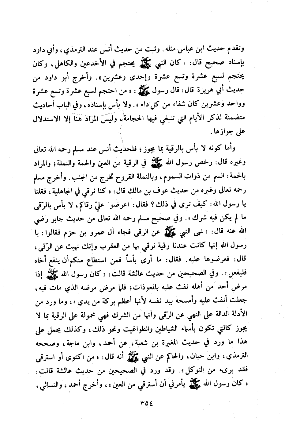 وأما كونه لا بأس بالرقية بما يجوز فلحديث أنس عند مسلم رحمه الله تعالى وغيره قال: رخص رسول الله صلى الله عليه وسلم في الرقية من العين والحمة والنملة والمراد بالحمة السم من ذوات السموم وبالنملة القروح تخرج من الجنب وأخرج مسلم رحمه الله تعالى وغيره من حديث عوف بن مالك قال: كنا نرقى في الجاهلية فقلنا يا رسول الله كيف ترى في ذلك فقال: "اعرضوا علي رقاكم لا بأس بالرقى ما لم يكن فيه شرك" وفي صحيح مسلم رحمه الله تعالى من حديث جابر رضي الله عنه قال: نهى النبي صلى الله عليه وسلم عن الرقي فجاء آل عمرو بن حزم فقالوا: يا رسول الله إنها كانت عندنا رقية نرقى بها من العقرب وإنك نهيت عن الرقي قال: فعرضوها عليه فقال: "ما أرى بأسا فمن استطاع منكم أن ينفع أخاه فليفعل" وفي الصحيحين من حديث عائشة قال: كان رسول الله صلى الله عليه وسلم إذا مرض أحد من أهله نفث عليه بالمعوذات فلما مرض مرضه الذي مات فيه جعلت أنفث عليه وأمسحه بيد نفسه لأنها أعظم بركة من يدي وما ورد من الأدلة الدالة على النهي عن الرقى وأنها من الشرك فهي محمولة على الرقية بما لا يجوز كالتي تكون بأسماء الشياطين والطواغيت ونحو ذلك وكذلك يحمل على هذا ما ورد في حديث المغيرة بن شعبة عن أحمد وابن ماجه وصححه الترمذي وابن حبان والحاكم عن النبي صلى الله عليه وسلم أنه قال: "من اكتوى أو استرقى فقد برىء من التوكل" وقد ورد في الصحيحين من حديث عائشة قالت: كان رسول الله صلى الله عليه وسلم يأمرني أن أسترقى من العين وأخرج أحمد والنسائي
