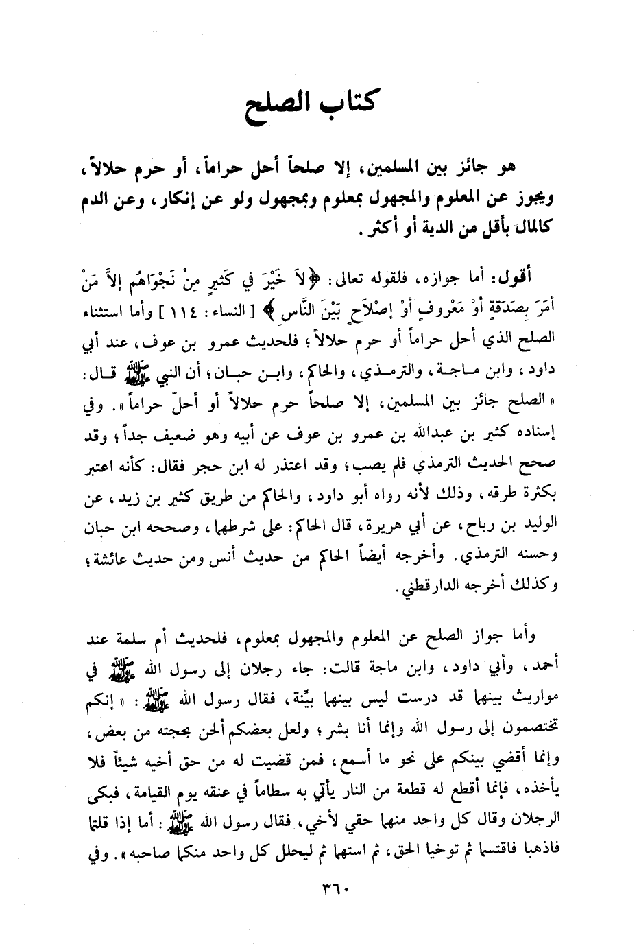 أقول: أما جوازه فلقوله تعالى: {لا خَيْرَ فِي كَثِيرٍ مِنْ نَجْوَاهُمْ إِلَّا مَنْ أَمَرَ بِصَدَقَةٍ أَوْ مَعْرُوفٍ أَوْ إِصْلاحٍ بَيْنَ النَّاسِ} [النساء:114] وأما استثناء الصلح الذي أحل حراما أو حرم حلالا فلحديث عمرو بن عوف عن أبي داود وابن ماجه والترمذي والحاكم وابن حبان أن النبي صلى الله عليه وسلم قال: الصلح جائز بين المسلمين إلا صلحا حرم حلالا أو أحل حراما وفي إسناده كثير بن عبد الله بن عمرو بن عوف عن أبيه وهو ضعيف جدا وقد صحح الترمذي فلم يصب وقد اعتذر له ابن حجر فقال: كأنه اعتبر بكثرة طرقه وذلك لأنه رواه أبو داود والحاكم من طريق كثير بن زيد عن الوليد بن رباح عن أبي هريرة قال: الحاكم على شرطهما وصححه ابن حبان وحسنه الترمذي وأخرجه أيضا الحاكم من حديث أنس ومن حديث عائشة وكذلك أخرجه الدارقطني.