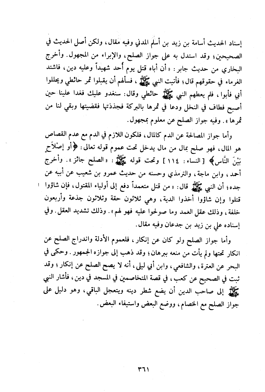وأما جواز المصالحة عن الدم كالمال فلكون اللازم في الدم مع عدم القصاص هو المال فهو صلح بمال عن مال يدخل تحت عموم قوله تعالى: أو إصلاح بين الناس وتحت قوله صلى الله عليه وسلم: "الصلح جائز" وأخرج أحمد وابن ماجه والترمذي وحسنه من حديث عمرو ابن شعيب عن أبيه عن جده أن النبي صلى الله عليه وسلم قال:"من قتل متعمدا دفع إلى أولياء المقتول فإن شاءوا قتلوا وإن شاءوا أخذوا الدية وهي ثلاثون حقة وثلاثون جذعة وأربعون خلفة وذلك عقل العمد وما صولحوا عليه فهو لهم".