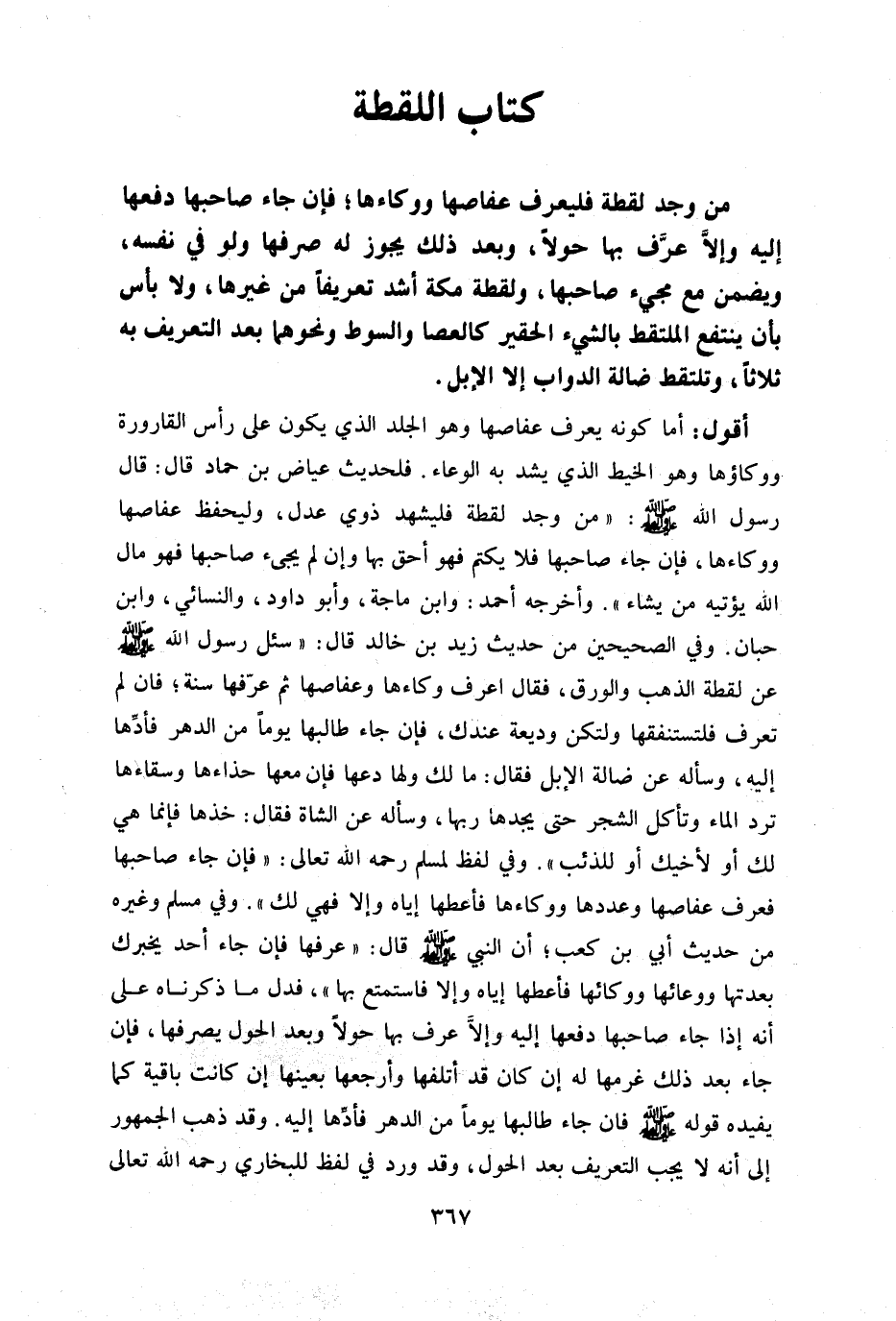 من وجد لقطة فليعرف عفاصها ووكاءها فإن جاء صاحبها دفعها إليه وإلا عرف بها حولا وبعد ذلك يجوز له صرفها ولو في نفسه ويضمن مع مجيء صاحبها ولقطة مكة أشد تعريفا من غيرها ولا بأس بأن ينتفع الملتقط بالشىء الحقير كالعصا والسوط ونحوهما بعد التعريف به ثلاثا وتلتقط ضالة الدواب إلا الإبل.