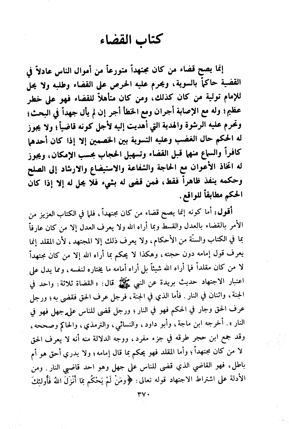 أقول: أما كون إنما يصح قضاء من كان مجتهدا فلما في الكتاب العزيز من الأمر بالقضاء بالعدل والقسط وبما أراه الله ولا يعرف العدل إلا من كان عارفا بما في الكتاب والسنة من الأحكام ولا يعرف ذلك إلا المجتهد لأن المقلد إنما يعرف قول إمامه دون حجته وهكذا لا يحكم بما أراه الله إلا من كان مجتهدا لا من كان مقلدا فما أراه الله شيئا بل أراه إمامه ما يختاره لنفسه وممايدل على اعتبار الإجتهاد حديث بريدة عن النبي صلى الله عليه وسلم قال: "القضاة ثلاثة واحد في الجنة واثنان في النار فأما الذي في الجنة فرجل عرف الحق فقضى به ورجل عرف الحق وجار في الحكم فهو في النار ورجل قضى للناس على جهل فهو في النار" أخرجه ابن ماجه وأبو داود والنسائي والترمذي والحاكم وصححه وقد جمع ابن حجر طرقة في جزء مفرد وجه الدلالة منه أنه لا يعرف الحق إلا من كان مجتهدا وأما المقلد فهو يحكم بما قال: إمامه ولا يدري أحق هو أم باطل فهو القاضي الذي قضى للناس على جهل وهو أحد قاضيي النار ومن الأدلة على اشتراط الاجتهاد قوله تعالى: {وَمَنْ لَمْ يَحْكُمْ بِمَا أَنْزَلَ اللَّهُ فَأُولَئِكَ