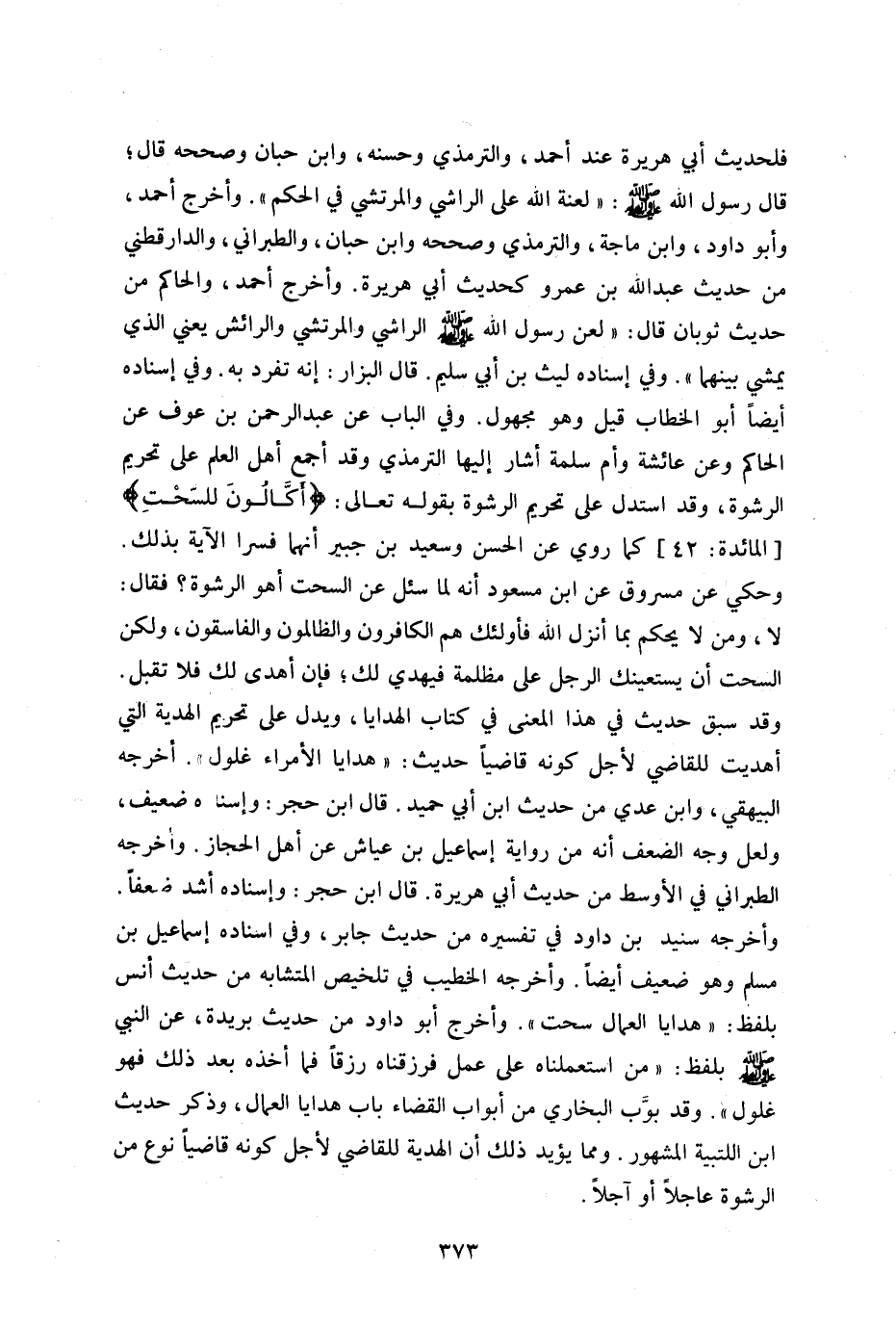 فلحديث أبي هريرة عند أحمد والترمذي وحسنه وابن حبان وصححه قال: قال رسول الله صلى الله عليه وسلم: "لعنة الله على الراشي والمرتشي في الحكم" وأخرج أحمد وأبو داود وابن ماجه والترمذي وصححه وابن حبان والطبراني والدارقطني من حديث عبد الله ابن عمرو كحديث أبي هريرة وأخرج أحمد والحاكم من حديث ثوبان قال: "لعن رسول الله صلى الله عليه وسلم الراشي والمرتشي والرائش يعنى الذي يمشي بينهما" وفي إسنادهما ليث بن أبي سليم قال: البزار إنه تفرد به وفي إسناده أيضا أبو الخطاب قيل وهو مجهول وفي الباب عن عبد الرحمن بن عوف عند الحاكم وعن عائشة وأم سلمة أشار إليها الترمذي وقد أجمع أهل العلم على تحريم الرشوة وقد استدل على تحريم الرشوة بقوله تعالى: {أَكَّالُونَ لِلسُّحْتِ} [المائدة:42] كما روى عن الحسن وسعيد بن جبير أنهما فسرا الآية بذلك وحكي عن مسروق عن ابن مسعود أنه لما سئل عن السحت أهو الرشوة؟ فقال: لا ومن لا يحكم بما أنزل الله فأولئك هم الكافرون والظالمون والفاسقون ولكن السحت أن يستعينك الرجل على مظلمة فيهدي لك فإن أهدي لك فلا تقبل وقد سبق حديث في هذا المعنى في كتاب الهدايا ويدل على تحريم الهدية التي أهديت للقاضي لأجل كونه قاضيا حديث "هدايا الأمراء غلول" أخرجه البيهقي وابن عدى من حديث ابن أبي حميد قال ابن حجر: وإسناده ضعيف ولعل وجه الضعف أنه من رواية إسماعيل بن عياش عن أهل الحجاز وأخرجه الطبراني في الأوسط من حديث أبي هريرة قال: ابن حجر وإسناده أشد ضعفا وأخرجه سنيد بن داود في تفسيره من حديث جابر وفي إسناده إسماعيل ابن مسلم وهو ضعيف أيضا وأخرجه الخطيب في تلخيص التشابه من حديث أنس بلفظ "هدايا العمال سحت" وأخرج أبو داود من حديث بريدة عن النبي صلى الله عليه وسلم بلفظ "من استعلمناه على عمل فرزقناه رزقا فما أخذه بعد ذلك فهو غلول" وقد بوب البخاري من أبواب القضاء باب هدايا العمال وذكر حديث ابن اللتبية المشهور ومما يؤيد ذلك أن الهدية للقاضي لأجل كونه قاضيا نوع من الرشوة عاجلا أو آجلا.