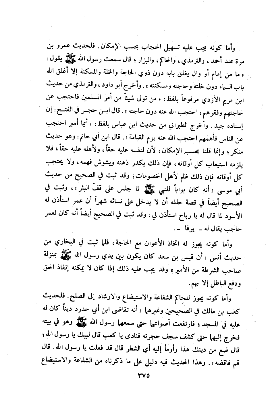 وأما كونه يجب عليه تسهيل الحجاب بحسب الإمكان فلحديث عمرو بن مرة عند أحمد والترمذي والحاكم والبزار قال: سمعت رسول الله صلى الله عليه وسلم يقول: "ما من إمام أو وال يغلق بابه دون ذوي الحاجة والخلة والمسكنة إلا أغلق الله باب السماء دون خلته وحاجته ومسكنته" وأخرج أبو داود والترمذي من حديث ابن مريم الأزدي مرفوعا بلفظ "من تولى شيئا من أمر المسلمين فاحتجب عن حاجتهم وفقرهم احتجب الله عنه دون حاجته" قال: ابن حجر في الفتح أن إسناده جيد وأخرج الطبراني من حديث ابن عباس بلفظ "أيما أمير احتجب عن الناس فأهملهم احتجب الله عنه يوم القيامة" قال ابن أبي حاتم: وهو حديث منكر وإنما قلنا بحسب الإمكان لأن لنفسه عليه حقا ولأهله عليه حقا فلا يلزمه استيعاب كل أوقاته فإن ذلك يكدر ذهنه ويشوش فهمه ولا يحتجب كل أوقاته فإن ذلك ظلم لأهل الخصومات وقد ثبت في الصحيح من حديث أبي موسى أنه كان بوابا للنبي صلى الله عليه وسلم لما جلس على قف البئر وثبت في الصحيح أيضا في قصة حلفه أن لا يدخل على نسائه شهرا أن عمر استأذن له الأسود لما قال: يا رباح استأذن لي وقد ثبت في الصحيح أيضا أنه كان لعمر حاجب يقال: له يرفا-.