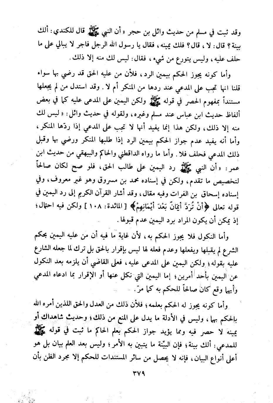 وأما كونه يجوز الحكم بيمين الرد فلأن من عليه الحق قد رضي بها سواء قلنا أنها تجب على المدعي عند ردها من المنكر أم لا وقد استدل من لم يجعلها مستندا بمفهوم الحصر في قوله صلى الله عليه وسلم: "ولكن اليمين على المدعى عليه" كما في بعض ألفاظ حديث ابن عباس عند مسلم وغيره ولقوله في حديث وائل: "ليس لك منه إلا ذلك" ولكن هذا إنما يفيد أنها لا تجب على المدعي إذا ردها المنكر وأما أنه يفيد عدم جواز الحكم بيمين الرد إذا طلبها المنكر ورضي بها وقبل ذلك المدعي فحلف فلا. وأما ما رواه الدارقطني والحاكم والبيهقي من حديث ابن عمر أن النبي صلى الله عليه وسلم رد اليمين على طالب الحق فلو صح لكان صالحا لتخصيص ما تقدم ولكن في إسناده محمد ابن مسروق وهو غير معروف وفي إسناده إسحاق بن الفرات وفيه مقال: وقد أشار القرآن الكريم إلى رد اليمين في قوله تعالى: {أَنْ تُرَدَّ أَيْمَانٌ بَعْدَ أَيْمَانِهِمْ} [المائدة:108] ولكن فيه احتمال إذ يمكن أن يكون المراد برد اليمين عدم قبولها.
