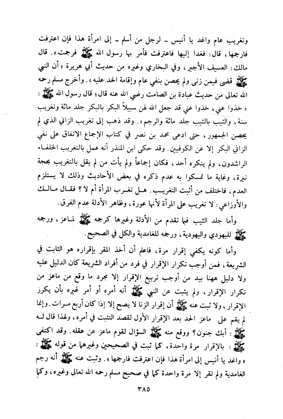 وتغريب عام واغد يا أنيس - لرجل من أسلم- إلى امرأة هذا فإن اعترفت فارجمها" قال: فغدا إليها فاعترفت فأمر بها رسول الله صلى الله عليه وسلم فرجمت قال مالك: العسيف الأجير وفي البخاري وغيره من حديث أبي هريرة أن النبي صلى الله عليه وسلم قضى فيمن زنى ولم يحصن بنفى عام وإقامة الحد عليه وأخرج مسلم رحمه الله تعالى من حديث عبادة بن الصامت رضي الله عنه قال: قال رسول الله صلى الله عليه وسلم: "خذوا عني قد جعل الله لهن سبيلا البكر بالبكر جلد مائة وتغريب سنة والثيب بالثيب جلد مائة والرجم" وقد ذهب إلى تغريب الزاني الذي لم يحصن الجمهور حتى ادعى محمد بن نصر في كتاب الإجماع الاتفاق على نفي الزاني البكر إلا عن الكوفيين وقد حكى بن المنذر أنه عمل بالتغريب الخلفاء الراشدون ولم ينكره أحد فكان إجماعا ولم يأت من لم يقل بالتغريب بحجة نيرة وغاية ما تمسكوا به عدم ذكره في بعض الأحاديث وذلك لا يستلزم العدم فاختلف من أثبت التغريب هل تغرب المرأة أم لا فقال: مالك والأوزاعي لا تغريب على المرأة لأنها عورة وظاهر الأدلة عدم الفرق.