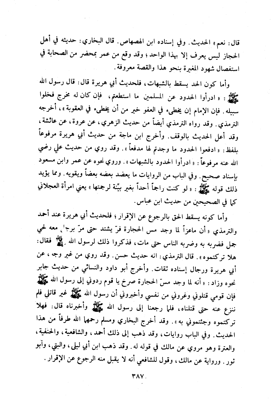 وأما كون الحد يسقط بالشبهات فلحديث أبي هريرة قال: قال رسول الله صلى الله عليه وسلم: "ادرأوا الحدود عن المسلمين ما استطعتم فإن كان له مخرج فخلوا سبيله فإن الإمام إن يخطىء في العفو خير من أن يخطيء في العقوبة" أخرجه الترمذي وقد رواه الترمذي أيضا من حديث الزهري عن عروة عن عائشة وقد أعل الحديث بالوقف وأخرج ابن ماجه من حديث أبي هريرة مرفوعا بلفظ "ادفعوا الحدود ما وجدتم لها مدفعا" وقد روي من حديث علي رضي الله عنه مرفوعا "ادرأوا الحدود بالشبهات" وروى نحوه عن عمر وابن مسعود بإسناد صحيح وفي الباب من الروايات ما يعضد بعضه بعضا ويقويه ومما يؤيد ذلك قوله: صلى الله عليه وسلم: "لو كنت راجما أحدا بغير بينة لرجمتها يعني امرأة العجلاني كما في الصحيحين من حديث ابن عباس.