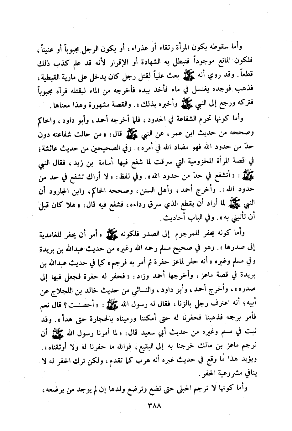 وأما كونه يحفر للمرجوم إلى الصدر فلكونه صلى الله عليه وسلم أمر أن يحفر للغامدية إلى صدرها وهو في صحيح مسلم رحمه الله وغيره من حديث عبد الله بن بريدة وفي مسلم وغيره أنه حفر لماعز حفرة ثم أمر به فرجم كما في حديث عبد الله بن بريدة في قصة ماعز وأخرجها أحمد وزاد حفرله حفرة فجعل فيها إلى صدره وأخرج أحمد وأبو داود والنسائي من حديث خالد بن اللجلاج عن أبيه أنه اعترف رجل بالزنا فقال: له رسول الله صلى الله عليه وسلم: "أحصنت"؟ قال نعم فأمر برجمه فذهبنا فحفرنا له حتى أمكننا ورميناه بالحجارة حتى هدأ وقد ثبت في مسلم وغيره من حديث أبي سعيد قال: لما أمرنا رسول الله صلى الله عليه وسلم أن نرجم ماعز بن مالك خرجنا به إلى البقيع فوالله ما حفرنا له ولا وثقناه ويؤيد هذا ما وقع في حديث غيره أنه هرب كما تقدم ولكن ترك الحفر له لا ينافي مشروعية الحفر.