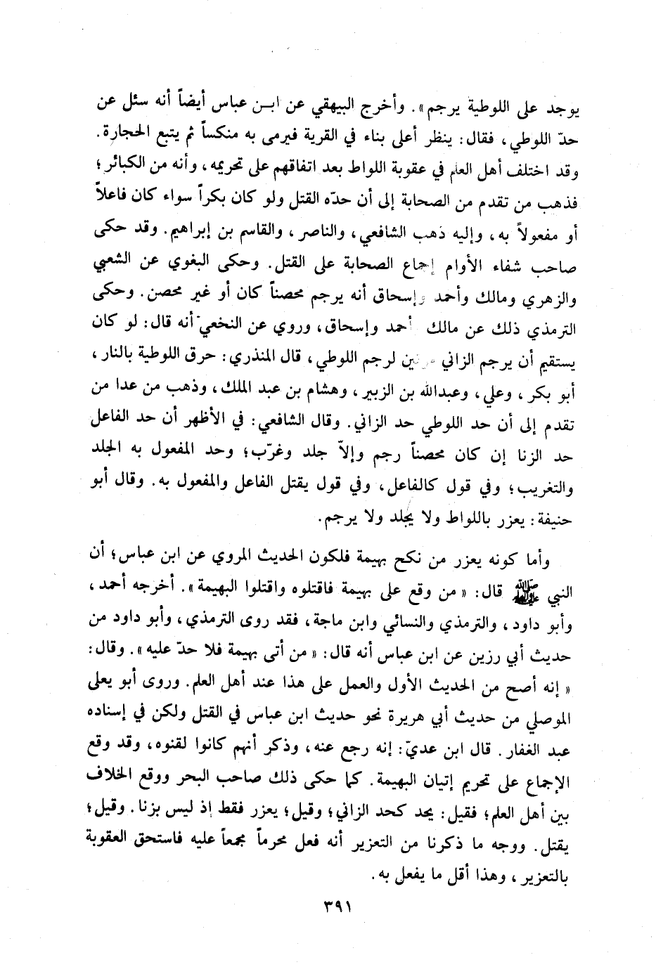 يوجد على اللوطية يرجم" وأخرج البيهقي عن ابن عباس أيضا أنه سئل عن حد اللوطي فقال: ينظر أعلى بناء في القرية فيرمى به منكسا ثم يتبع الحجارة وقد اختلف أهل العلم في عقوبة اللواط بعد اتفاقهم على تحريمه وأنه من الكبائر فذهب من تقدم من الصحابة إلى أن حده القتل ولو كان بكرا سواء كان فاعلا أو مفعولا به وإليه ذهب الشافعي والناصر والقاسم بن إبراهيم وقد حكى صاحب شفاء الأوام إجماع الصحابة على القتل وحكى البغوي عن الشعبي والزهري ومالك وأحمد وإسحاق وروى عن النخعي أنه قال: لو كان يستقيم أن يرجم الزاني مرتين لرجم اللوطي قال المنذري حرق اللوطية بالنار أبو بكر وعلي وعبد الله ابن الزبير وهشام بن عبد الملك وذهب من عدا من تقدم إلى أن حد اللوطي حد الزاني وقال الشافعي: في الأظهر أن حد الفاعل حد الزنا إن كان محصنا رجم وإلا جلد وغرب وحد المفعول به الجلد والتغريب وفي قول كالفاعل وفي قول يقتل الفاعل والمفعول به وقال: أبو حنيفة يعزر باللواط ولا يجلد ولا يرجم.