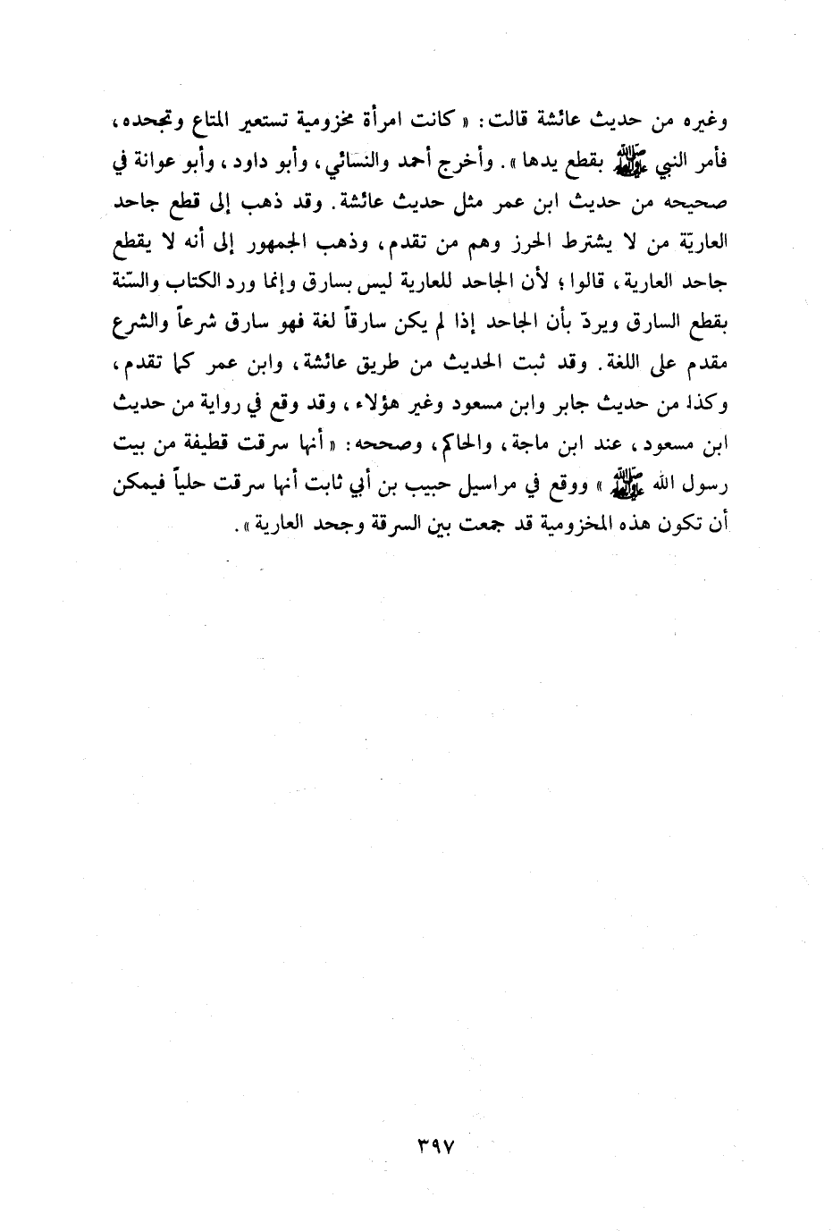 وغيره من حديث عائشة قالت: كانت امرأة مخزومية تستعير المتاع وتجحده فأمر النبي صلى الله عليه وسلم بقطع يدها وأخرج أحمد والنسائي وأبو داود وأبو عوانة في صحيحه من حديث ابن عمر مثل حديث عائشة وقد ذهب إلى قطع جاحد العارية من لا يشترط الحرز وهم من تقدم وذهب الجمهور إلى أنه لا يقطع جاحد العارية قالوا لأن الجاحد للعارية ليس بسارق وإنما ورد الكتاب والسنة بقطع السارق ويرد بأن الجاحد إذا لم يكن سارقا لغة فهو سارق شرعا والشرع مقدم على اللغة وقد ثبت الحديث من طريق عائشة وابن عمر كما تقدم وكذا من حديث جابر وابن مسعود وغير هؤلاء وقد وقع في رواية من حديث ابن مسعود عند ابن ماجه والحاكم وصححه أنها سرقت قطيفة من بيت رسول الله صلى الله عليه وسلم ووقع في مراسيل حبيب بن أبي ثابت أنها سرقت حليا فيمكن أن تكون هذه المخزومية قد جمعت بين السرقة وجحد العارية"