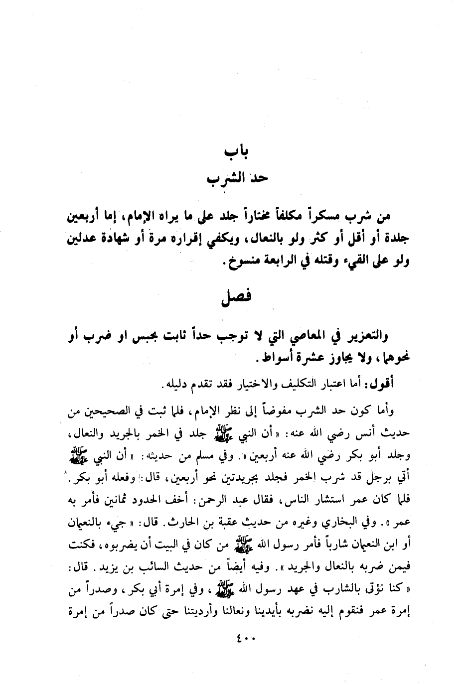 وأما كون حد الشرب مفوضا إلى نظر الإمام فلما ثبت في الصحيحين من حديث أنس رضي الله عنه أن النبي صلى الله عليه وسلم جلد في الخمر بالجريد والنعال وجلد أبو بكر رضي الله عنه أربعين وفي مسلم من حديثه أن النبي صلى الله عليه وسلم أتى برجل قد شرب الخمر فجلد بجريدتين نحو أربعين قال: وفعله أبو بكر فلما كان عمر استشار الناس فقال: عبد الرحمن أخف الحدود ثمانين جلده فأمر به عمر وفي البخاري وغيره من حديث عقبة بن الحارث قال: جيء بالنعمان شاربا فأمر رسول الله صلى الله عليه وسلم من كان في البيت أن يضربوه فكنت فيمن ضربه بالنعال والجريد وفيه أيضا من حديث السائب بن يزيد قال: كنا نؤتى بالشارب في عهد رسول الله صلى الله عليه وسلم وفي إمرة أبي بكر وصدرا من إمرة عمر فنقوم نضربه بأيدينا ونعالنا وأرديتنا حتى كان صدرا من أمرة