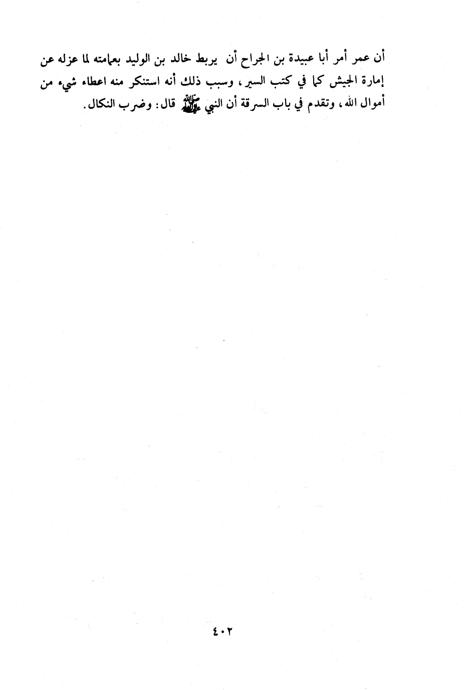 أن عمر أمر أبا عبيدة بن الجراح أن يربط خالد بن الوليد بعمامته لما عزله عن إمارة الجيش كما في كتب السير وسبب ذلك أنه استنكر منه إعطاء شيء من أموال الله وتقدم في باب السرقة أن النبي صلى الله عليه وسلم قال: وضرب النكال.