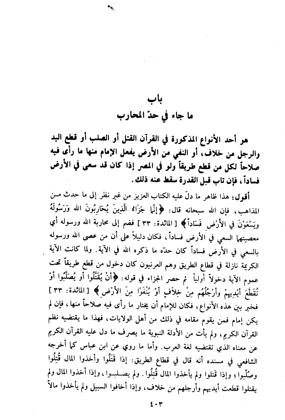 هو أحد الأنواع المذكورة في القرآن القيل أو الصلب أو قطع اليد والرجل من خلاف أو النفي من الأرض يفعل الإمام منها ما رأى فيه صلاحا لكل من قطع طريقا ولو في المصر إذا كان قد سعى في الأرض فسادا فإن تاب قبل القدرة سقط عنه ذلك.