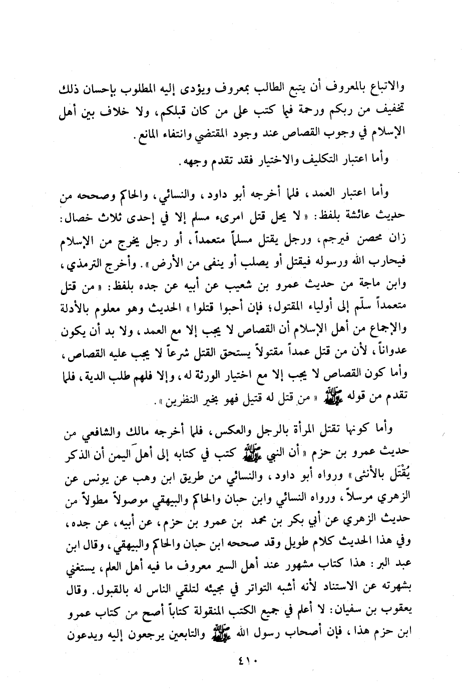 وأما كونها تقتل المرأة بالرجل والعكس فلما أخرجه مالك والشافعي من حديث عمرو بن حزم أن النبي صلى الله عليه وسلم كتب في كتابه إلى اليمن "أن الذكر يقتل بالأنثى" ورواه أبو داود والنسائي من طريق ابن وهب عن يونس عن الزهري مرسلا ورواه النسائي وابن حبان والحاكم والبيهقي موصولا مطولا من حديث الزهري عن أبي بكر بن محمد بن عمرو بن حزم عن أبيه عن جده وفي هذا الحديث كلام طويل وقد صححه ابن حبان والحاكم والبيهقي وقال: ابن عبد البر هذا كتاب مشهور عند أهل السير معروف ما فيه عند أهل العلم يستغنى بشهرته عن الإستناد لأنه أشبه التواتر في مجيئه لتلقي الناس له بالقبول وقال: يعقوب بن سفيان لا أعلم في جميع الكتب المنقولة كتابا أصح من كتاب عمرو بن حزم هذا فإن أصحاب رسول الله والتابعين يرجعون إليه ويدعون