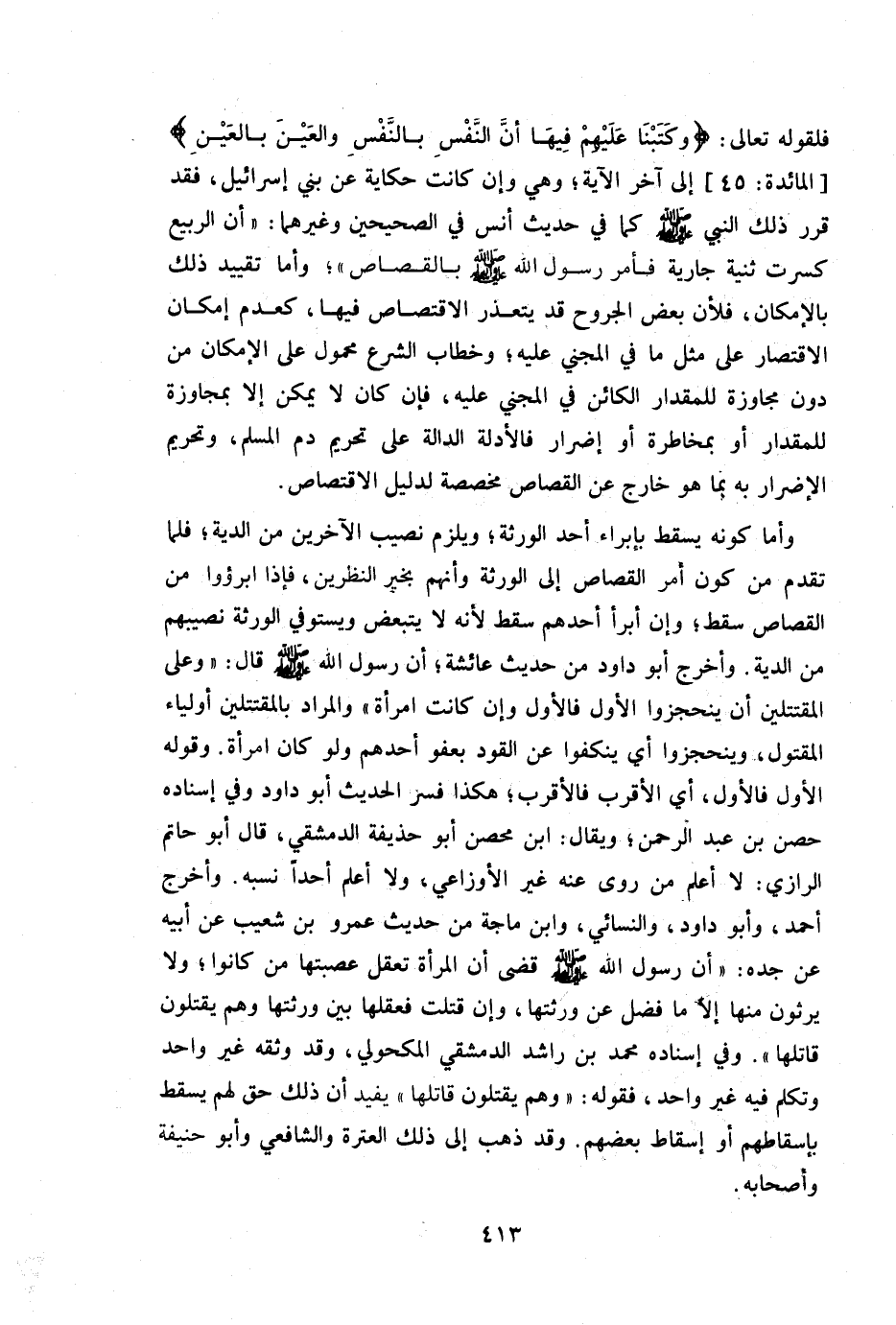 وأما كونه يسقط بإبراء أحد الورثه ويلزم نصيب الآخرين من الدية فلما تقدم من كون أمر القصاص إلى الورثة وأنهم بخير النظرين فإذا أبرأوا من القصاص سقط وإن أبرأ أحدهم سقط لأنه لا يتبعض ويستوفي الورثة نصيبهم من الدية وأخرج أبو داود من حديث عائشة أن رسول الله صلى الله عليه وسلم قال: "وعلى المقتتلين أن ينحجزوا الأول فالأول وإن كانت امرأة" والمراد بالمقتتلين أولياء المقتول وينحجزوا أي ينكفوا عن القود بعفو أحدهم ولو كان امرأة وأما قوله: الأول فالأول أي الأقرب فالأقرب هكذا فسر الحديث أبو داود وفي إسناده حصن بن عبد الرحمن ويقال: ابن محصن أبو حذيفة الدمشقي قال: أبو حاتم الرازي لا أعلم من روى عنه غير الأوزاعي ولا أعلم أحدا نسبه وأخرج أحمد وأبو داود والنسائي وابن ماجه من حديث عمرو بن شعيب عن أبيه عن جده أن رسول الله صلى الله عليه وسلم قضى أن المرأة تعقل عصبتها من كانوا ولا يرثون منها إلا ما فضل عن ورثتها وإن قتلت فعقلها بين ورثتها وهم يقتلون قاتلها وفي إسناده محمد بن راشد الدمشقي المكحولي وقد وثقه غير واحد وتكلم فيه غير واحد فقوله: وهم يقتلون قاتلها يفيد ان ذلك حق لهم يسقط بإسقاطهم أو إسقاط بعضهم وقد ذهب إلى ذلك العترة والشافعي وأبو حنيفة وأصحابه.