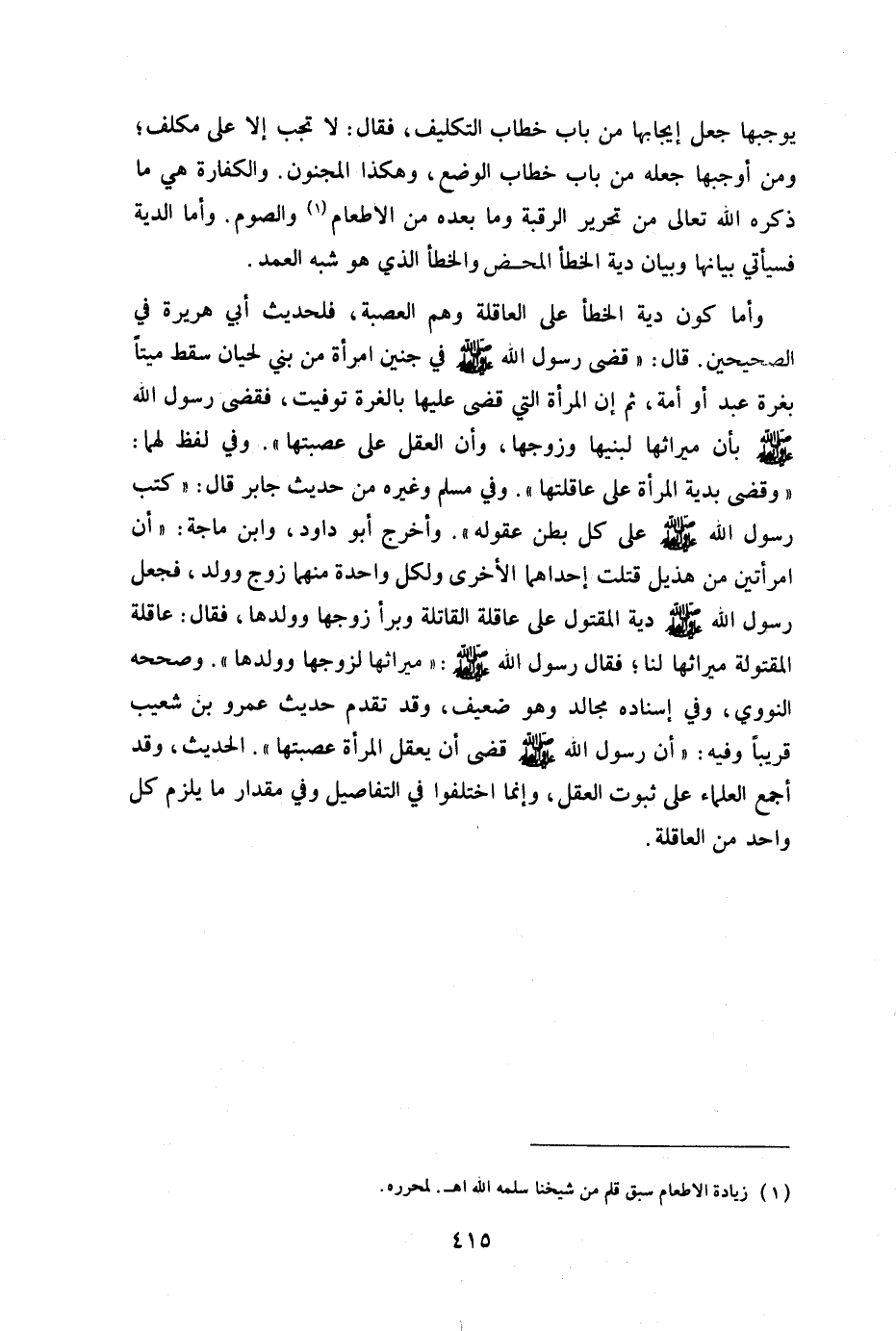 وأما كون دية الخطا على العاقلة وهم العصبة فلحدجيث أبي هريرة في الصحيحين قال: قضى رسول الله صلى الله عليه وسلم في جنين امرأة من بني لحيان سقط ميتا بغرة عبد او أمة ثم إن المرأة التي قضى عليها بالغرة توفيت فقضى رسول الله صلى الله عليه وسلم بأن ميراثها لبنيها وزوجها وأن العقل على عصبتها وفي لفظ لهما وقضى بدية المرأة على عاقلتها وفي مسلم وغيره من حديث جابر قال: كتب رسول الله صلى الله عليه وسلم على كل بطن عقولة وأخرج أبو داود وابن ماجه أن امرأتين من هذيل قتلت إحداهما الأخرى ولكل واحدة منهما زوج وولد فجعل رسول الله صلى الله عليه وسلم دية المقتول على عاقلة القاتلة وبرأ زوجها وولدها فقال: عاقلة المقتولة ميراثها لنا فقال: رسول الله صلى الله عليه وسلم " ميراثها لزوجها وولدها" وصححه النووي وفي إسناده مجالد وهو ضعيف وقد تقدم حديث عمرو بن شعيب قريبا وفيه أن رسول الله صلى الله عليه وسلم قضى أن يعقل المرأة عصبتها الحديث وقد أجمع العلماء على ثبوت العقل وإنما اختلفوا في التفاصيل وفي مقدار ما يلزم كل واحد من العاقلة.