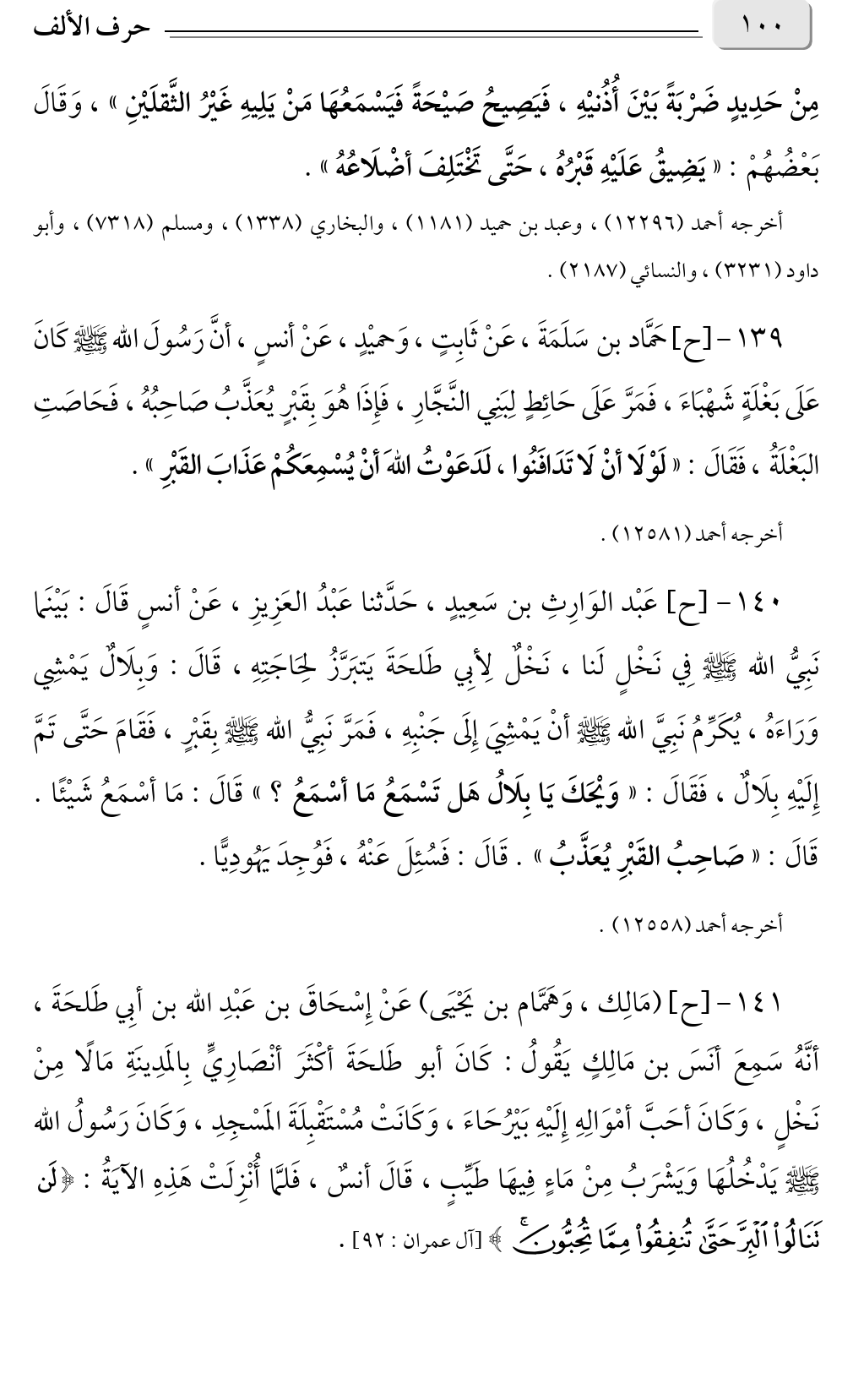 ١٣٩ - [ح] حَمَّاد بن سَلَمَةَ، عَنْ ثَابِتٍ، وَحميْدٍ، عَنْ أنسٍ، أنَّ رَسُولَ الله صلى الله عليه وسلم كَانَ عَلَى بَغْلَةٍ شَهْبَاءَ، فَمَرَّ عَلَى حَائِطٍ لِبَنِي النَّجَّارِ، فَإِذَا هُوَ بِقَبْرٍ يُعَذَّبُ صَاحِبُهُ، فَحَاصَتِ البَغْلَةُ، فَقَالَ: «لَوْلَا أنْ لَا تَدَافَنُوا، لَدَعَوْتُ اللهَ أنْ يُسْمِعَكُمْ عَذَابَ القَبْرِ».