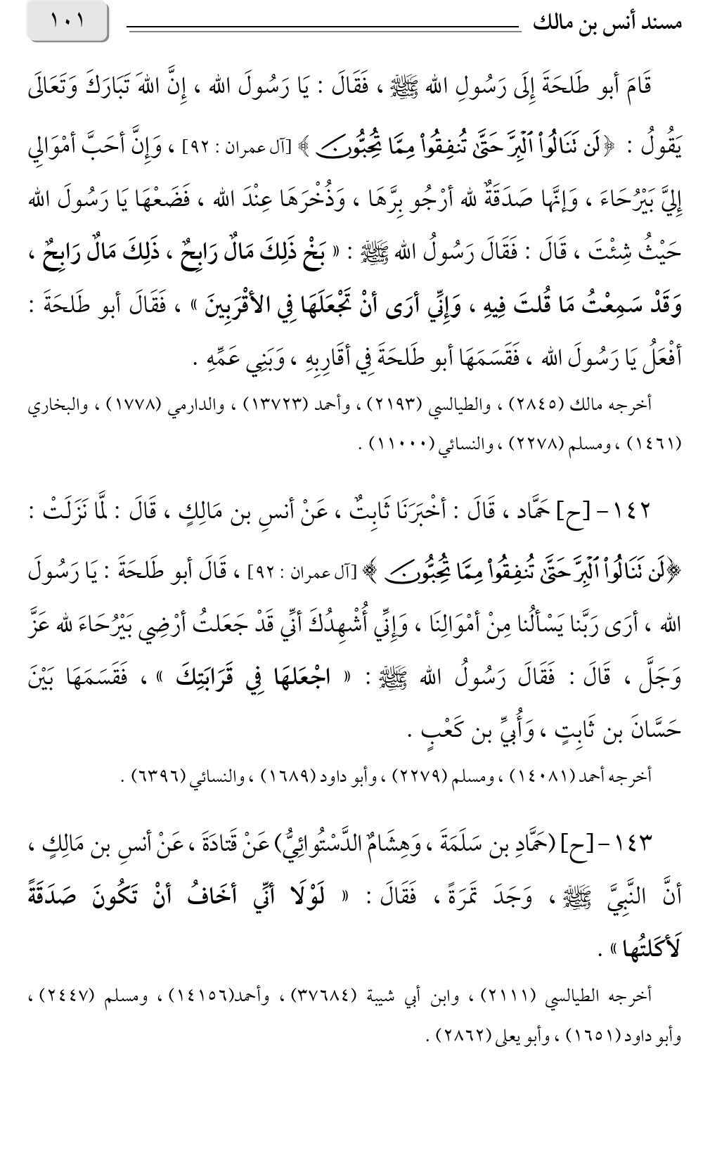 ١٤٢? -[ح] حَمَّاد، قَالَ: أخْبَرَنَا ثَابِتٌ، عَنْ أنسِ بن مَالِكٍ، قَالَ: لمَّا نَزَلَتْ: {لَنْ تَنَالُوا الْبِرَّ حَتَّى تُنْفِقُوا مِمَّا تُحِبُّونَ} [آل عمران: ٩٢]، قَالَ أبو طَلحَةَ: يَا رَسُولَ الله، أرَى رَبَّنا يَسْألُنا مِنْ أمْوَالِنَا، وَإِنِّي أُشْهِدُكَ أنِّي قَدْ جَعَلتُ أرْضِي بَيْرُحَاءَ لله عَزَّ وَجَلَّ، قَالَ: فَقَالَ رَسُولُ الله صلى الله عليه وسلم: «اجْعَلهَا فِي قَرَابَتِكَ»، فَقَسَمَهَا بَيْنَ حَسَّانَ بن ثَابِتٍ، وَأُبيِّ بن كَعْبٍ.