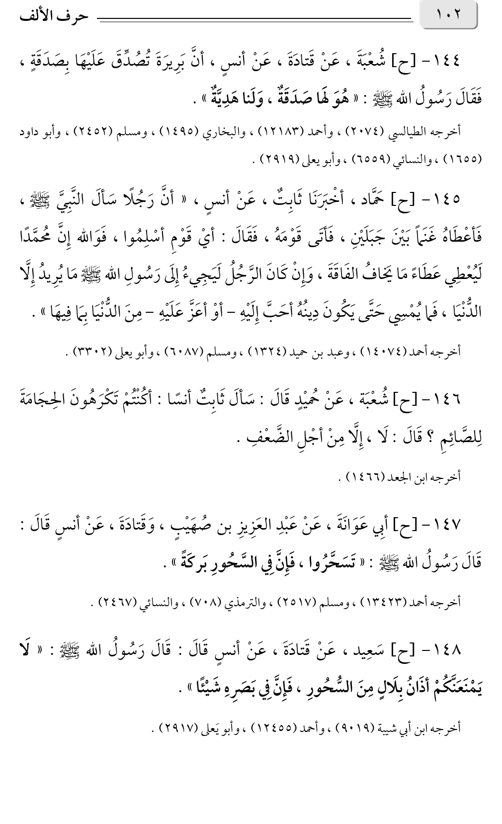 ١٤٤ - [ح] شُعْبَةَ، عَنْ قَتادَةَ، عَنْ أنسٍ، أنَّ بَرِيرَةَ تُصُدِّقَ عَلَيْهَا بِصَدَقَةٍ، فَقَالَ رَسُولُ الله صلى الله عليه وسلم: «هُوَ لَهَا صَدَقَةٌ، وَلَنا هَدِيَّةٌ».