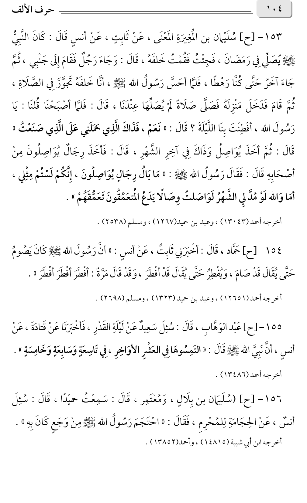 ١٥٣ - [ح] سُلَيْمان بن المُغِيرَةِ المَعْنَى، عَنْ ثَابِتٍ، عَنْ أنسٍ قَالَ: كَانَ النَّبِيُّ صلى الله عليه وسلم يُصَلِّي فِي رَمَضَانَ، فَجِئْتُ فَقُمْتُ خَلفَهُ، قَالَ: وَجَاءَ رَجُلٌ فَقَامَ إِلَى جَنْبِي، ثُمَّ جَاءَ آخَرُ حَتَّى كُنَّا رَهْطًا، فَلمَّا أحَسَّ رَسُولُ الله صلى الله عليه وسلم، أنَّا خَلفَهُ تَجوَّزَ فِي الصَّلَاةِ، ثُمَّ قَامَ فَدَخَلَ مَنْزِلَهُ فَصَلَّى صَلَاةً لَمْ يُصَلِّهَا عِنْدَنَا، قَالَ: فَلمَّا أصْبَحْنَا قُلنَا: يَا رَسُولَ الله، أفَطِنْتَ بِنَا اللَّيْلَةَ؟ قَالَ: «نَعَمْ، فَذَاكَ الَّذِي حَمَلَنِي عَلَى الَّذِي صَنَعْتُ»: قَالَ: ثُمَّ أخَذَ يُوَاصِلُ وَذَاكَ فِي آخِرِ الشَّهْرِ، قَالَ: فَأخَذَ رِجَالٌ يُوَاصِلُونَ مِنْ أصْحَابِهِ قَالَ: فَقَالَ رَسُولُ الله صلى الله عليه وسلم: «مَا بَالُ رِجَالٍ يُوَاصِلُونَ، إِنَّكُمْ لَسْتُمْ مِثْلِي، أمَا وَالله لَوْ مُدَّ لِي الشَّهْرُ لَوَاصَلتُ وِصَالًا يَدَعُ المُتعَمِّقُونَ تَعَمُّقَهُمْ».